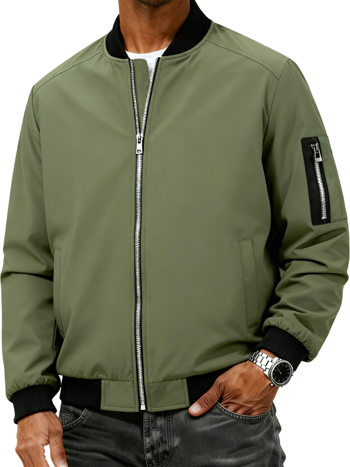 Men's Simple Casual Ribbed Stand Collar Zipper Long Sleeved Jacket