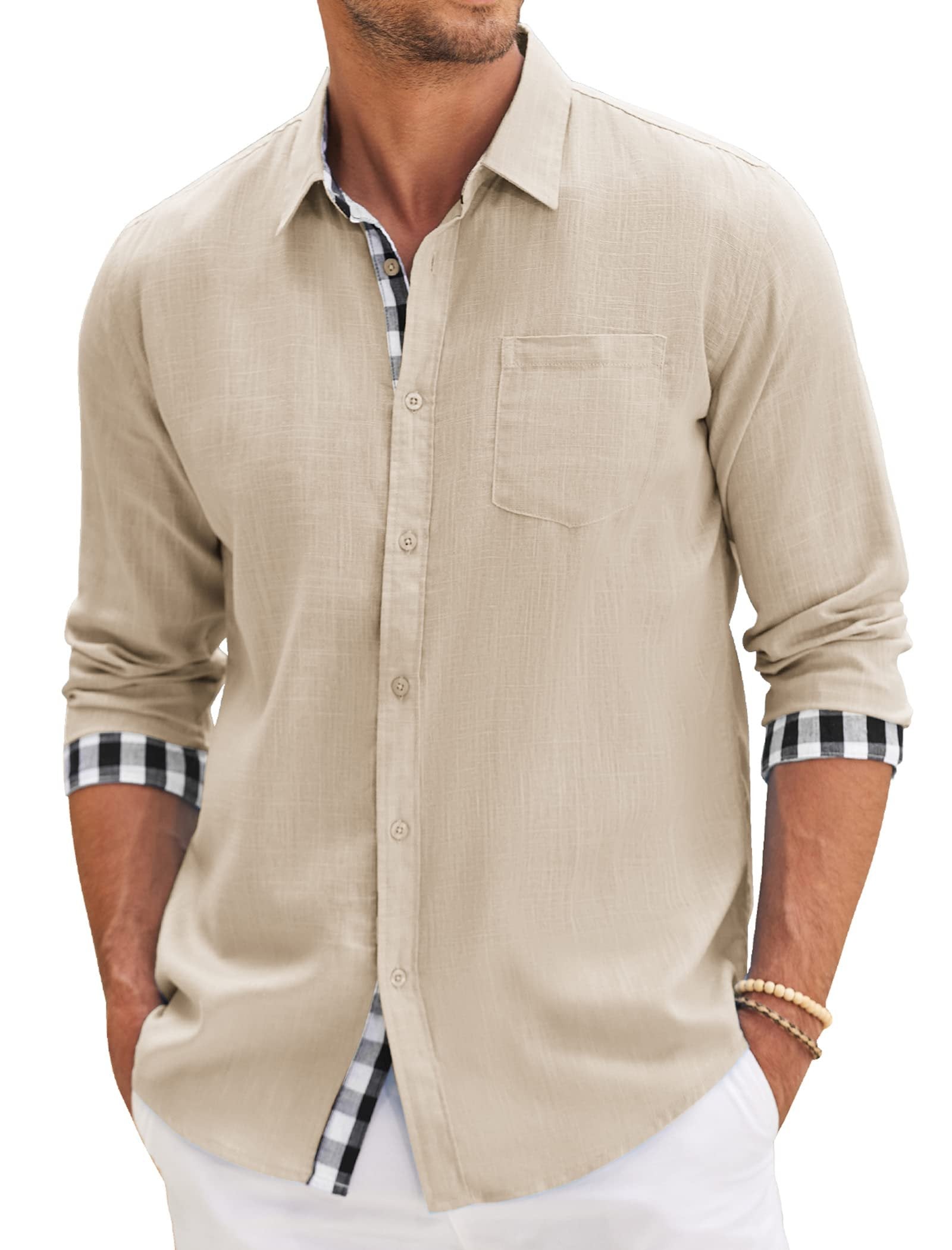 Men's Cotton Aand Linen Simple Basic Plaid Pocket Classic Long-Sleeved Shirt
