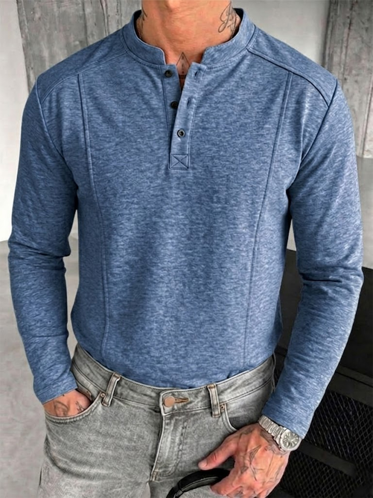 Men's Stand-up Collar Button-down Design Casual Long-sleeved Henley Shirt