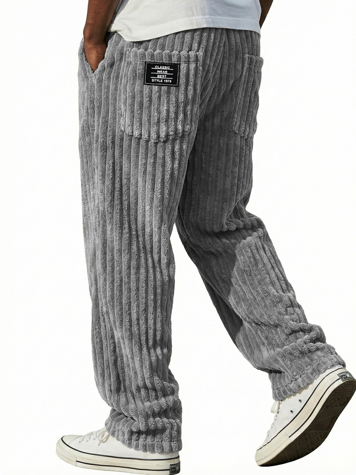 Men's Vintage Corduroy Textured Comfort Wide Striped Pants with Embroidered Minimalist Labels