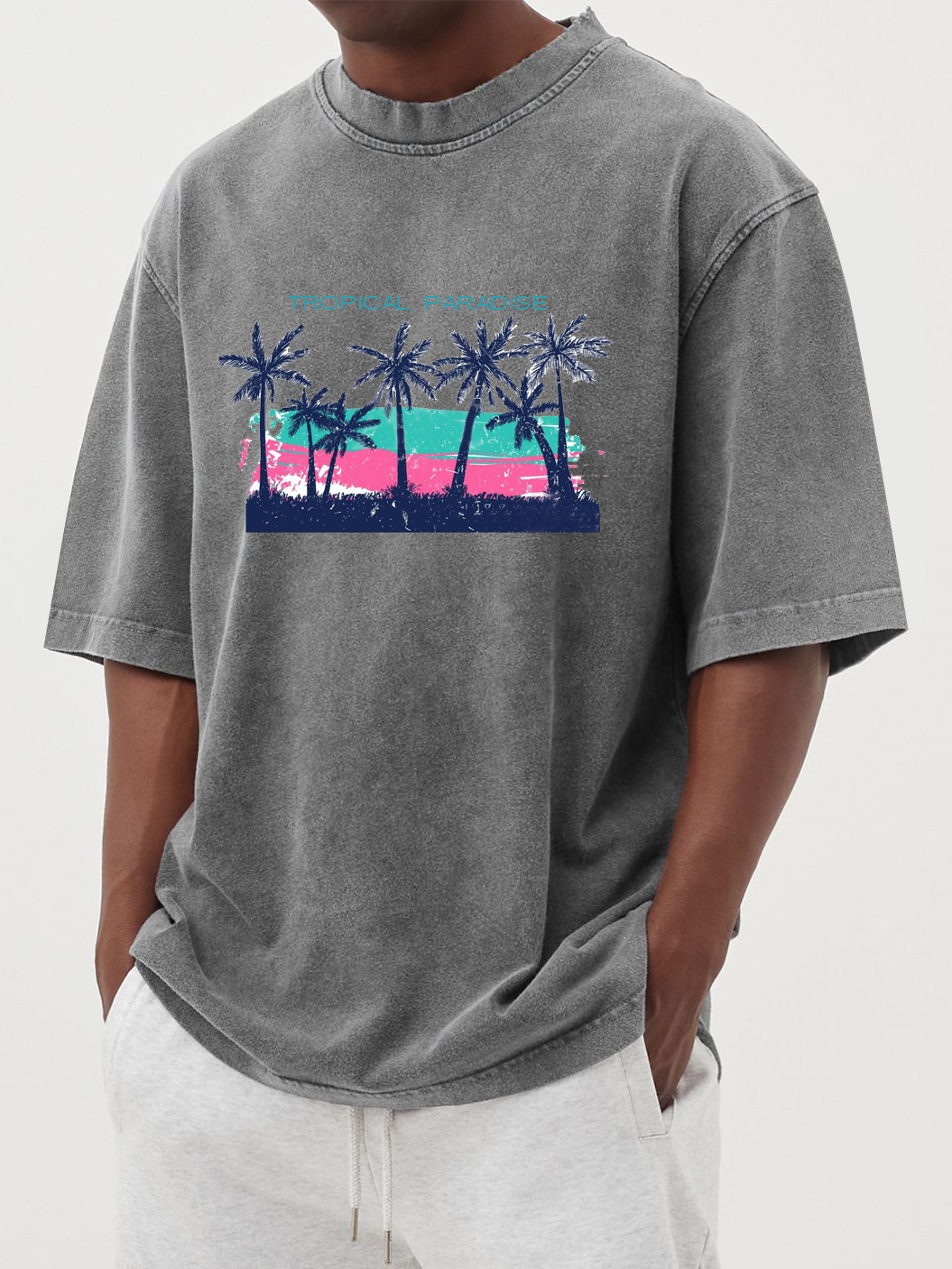 Tropical Palm Tree Print Washed And Distressed Cotton Short-sleeved T-shirt