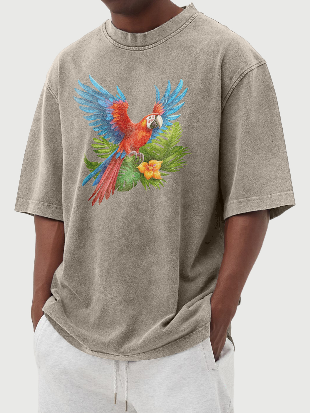 Men's Summer 100% Cotton Washed Distressed Parrot Print Short-sleeved T-shirt