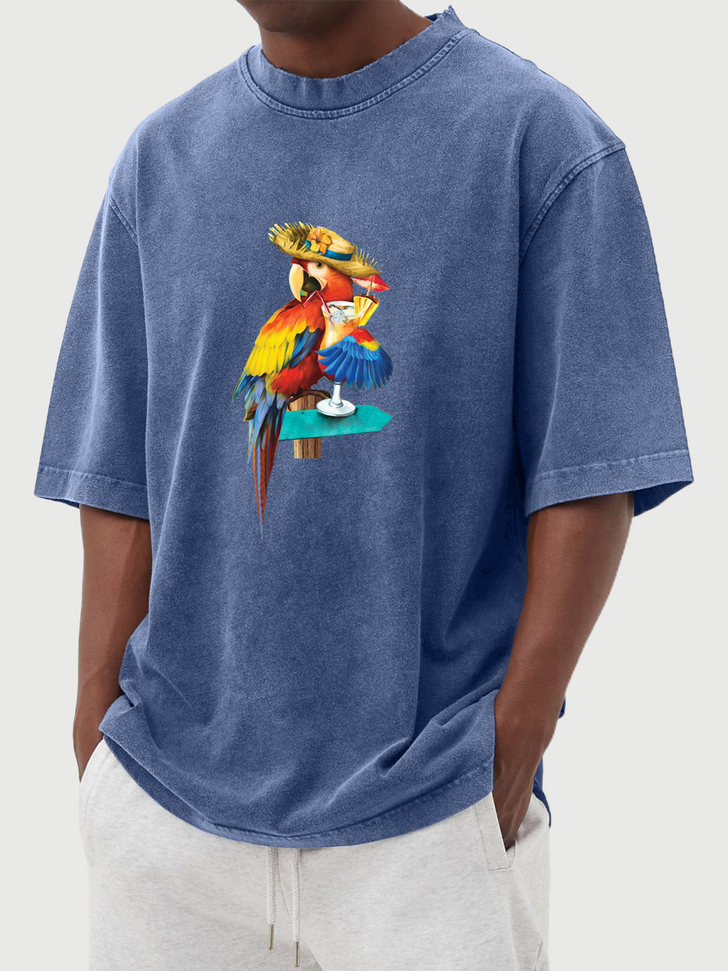 Men's Parrot Cocktail Hawaiian Print Washed Distressed Cotton T-Shirt Top