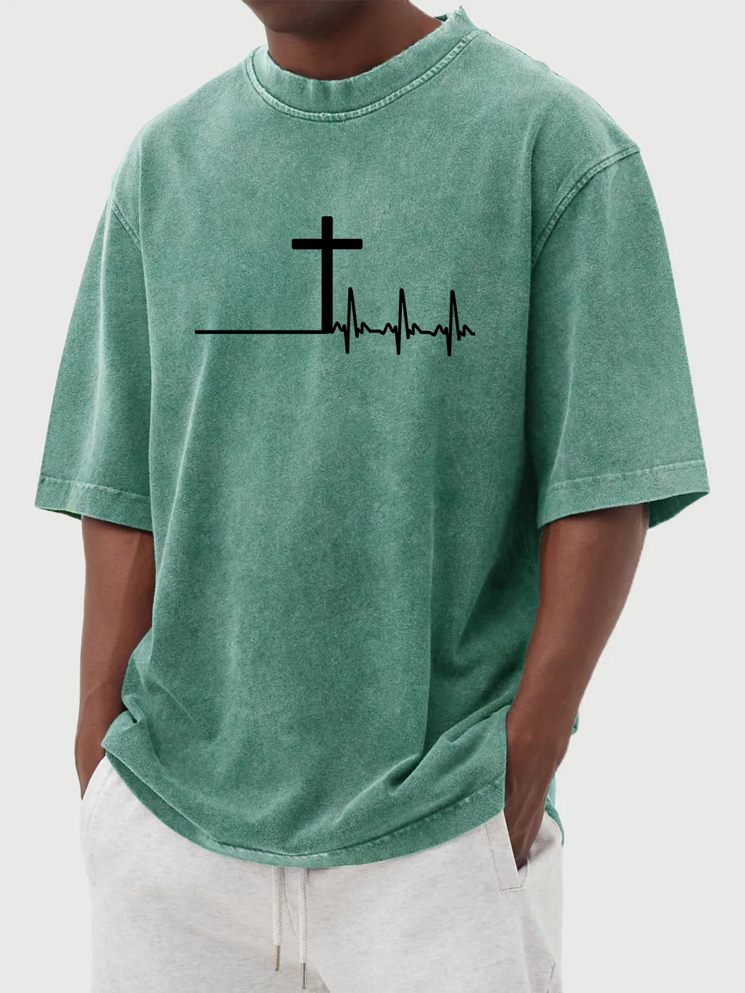Men's vintage washed distressed cross print short-sleeved T-shirt