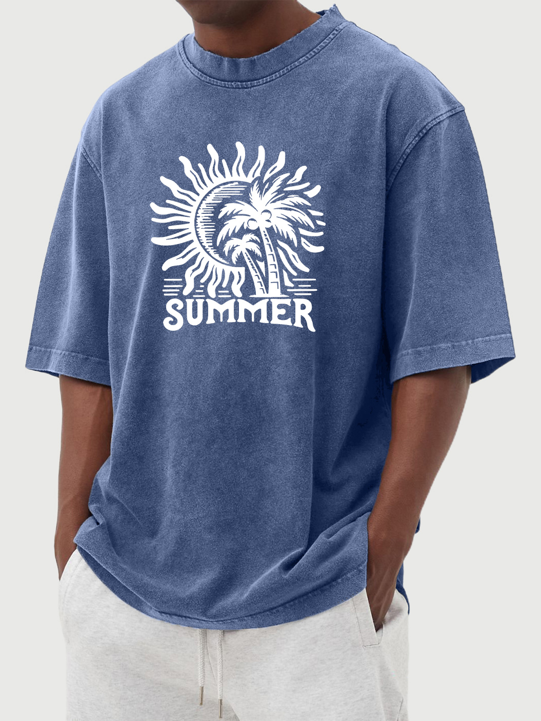 Men's vintage washed Hawaiian summer coconut sun print short-sleeved T-shirt