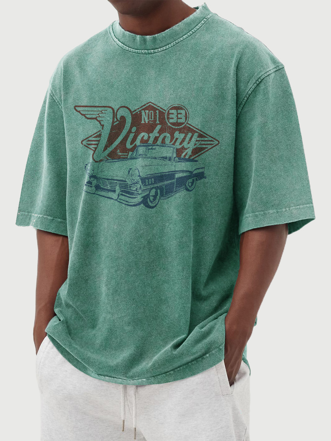 Men's 100% Cotton Washed Distressed Vintage Car Print Short Sleeve T-shirt