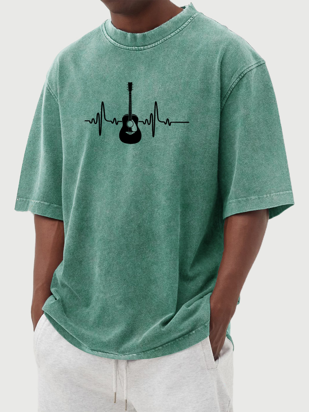Men's Vintage Washed Guitar Music Print Cotton Short Sleeve T-shirt