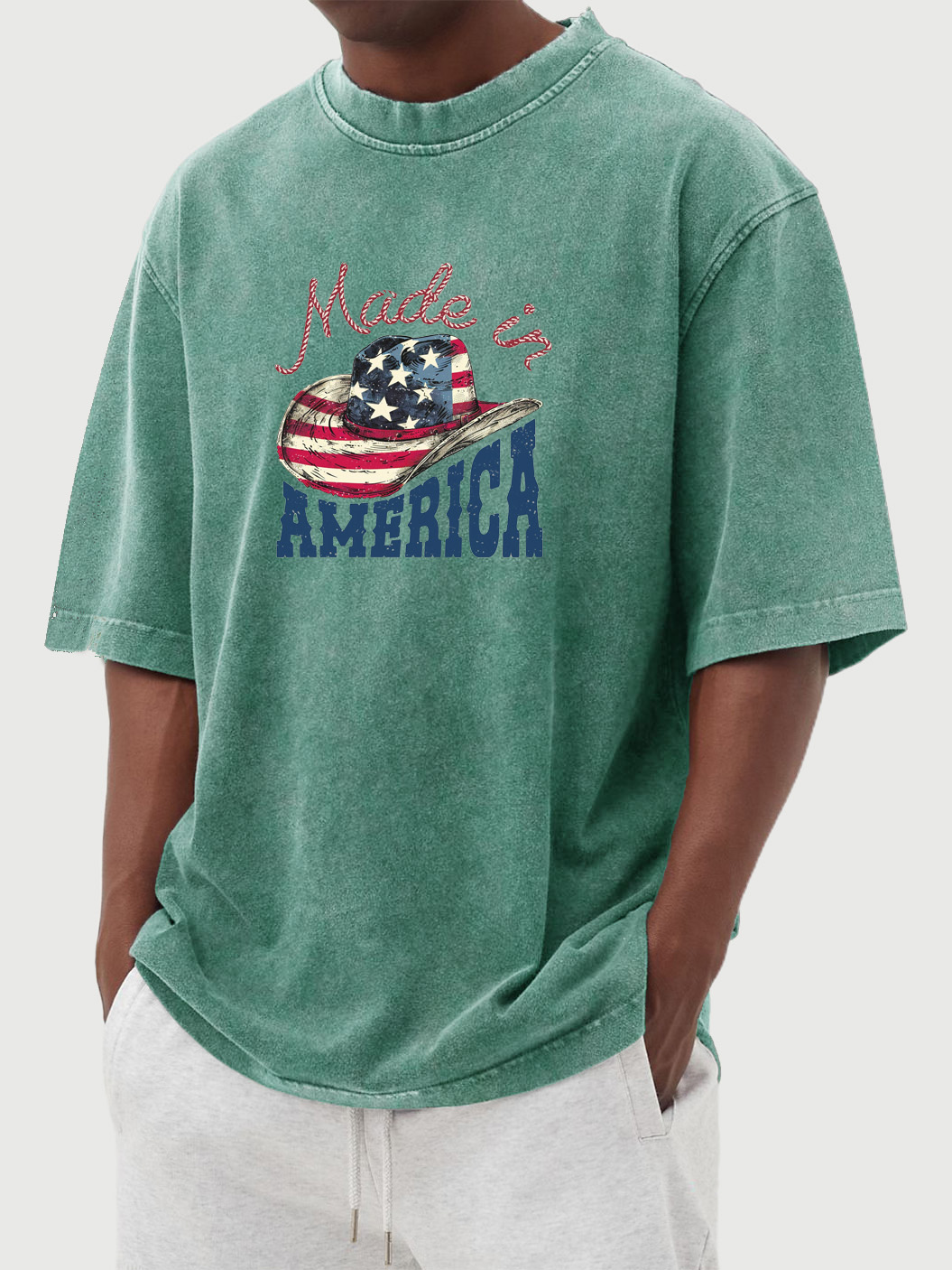 Men's Vintage Washed American Flag Cowboy Hat Print Short Sleeve T-shirt