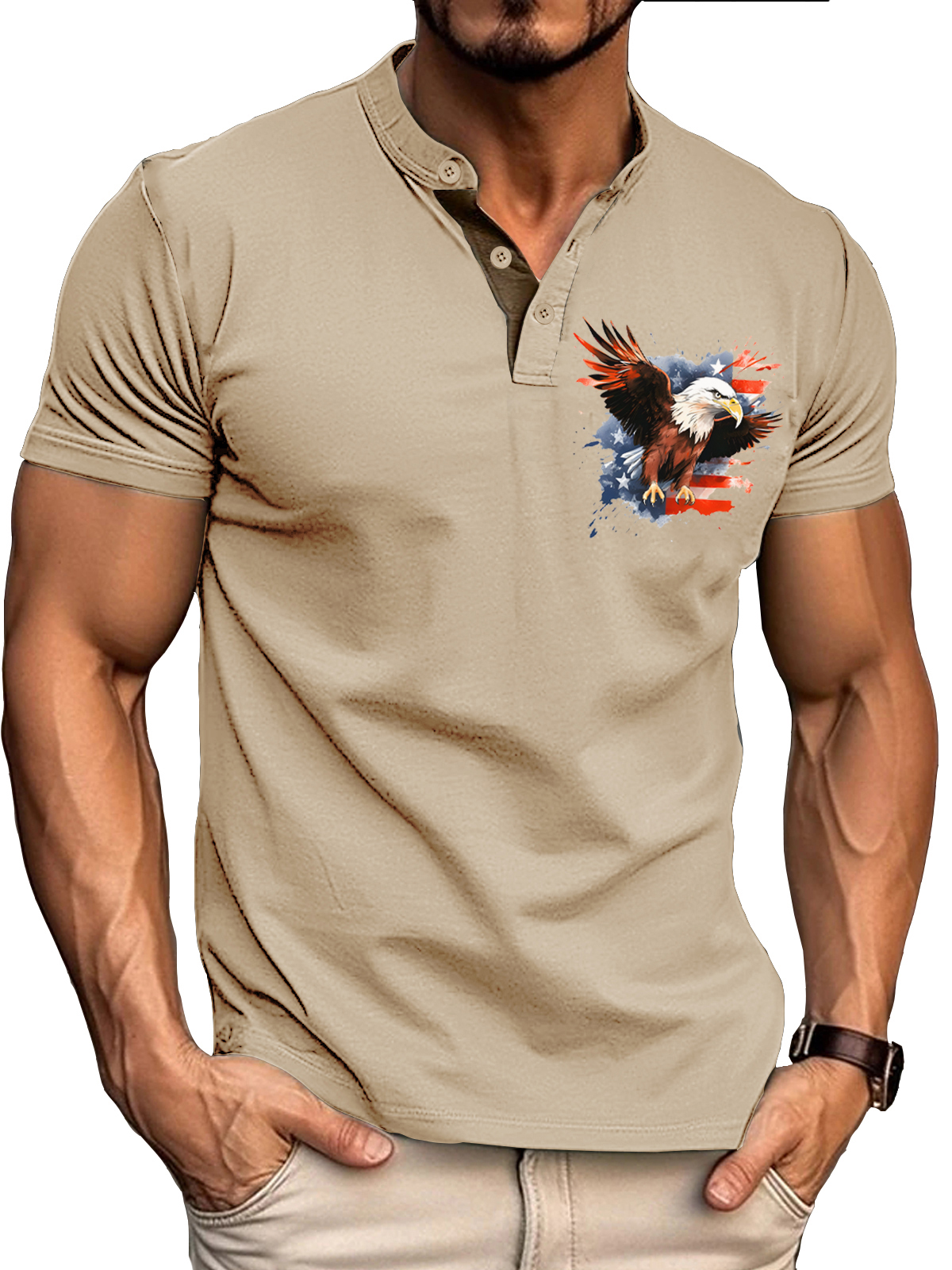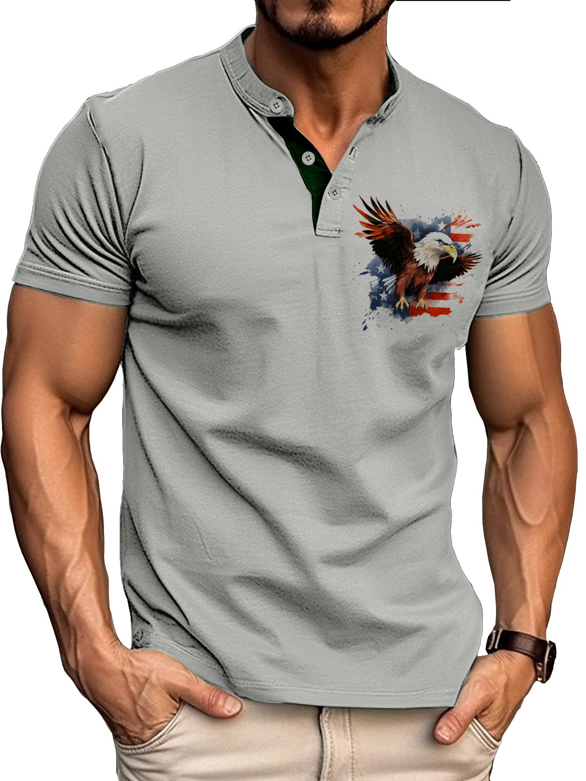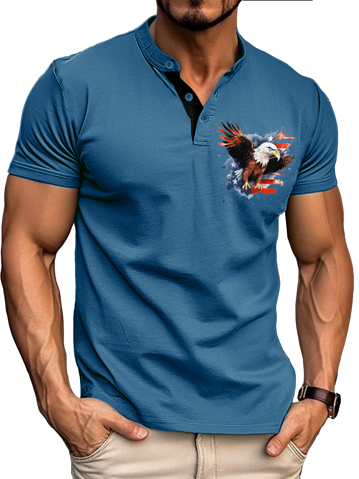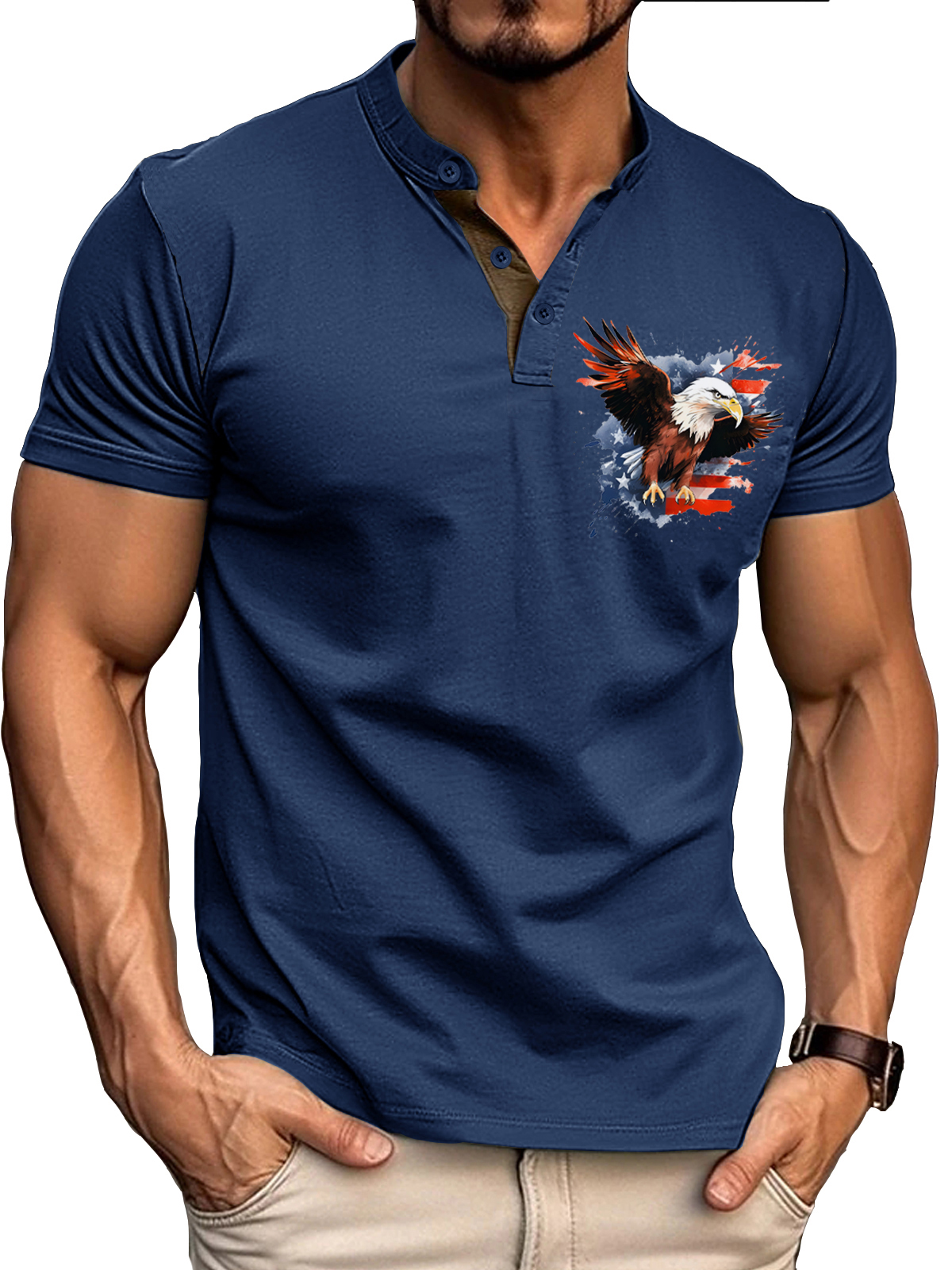 Men's Vintage Eagle American Flag Print Henley
