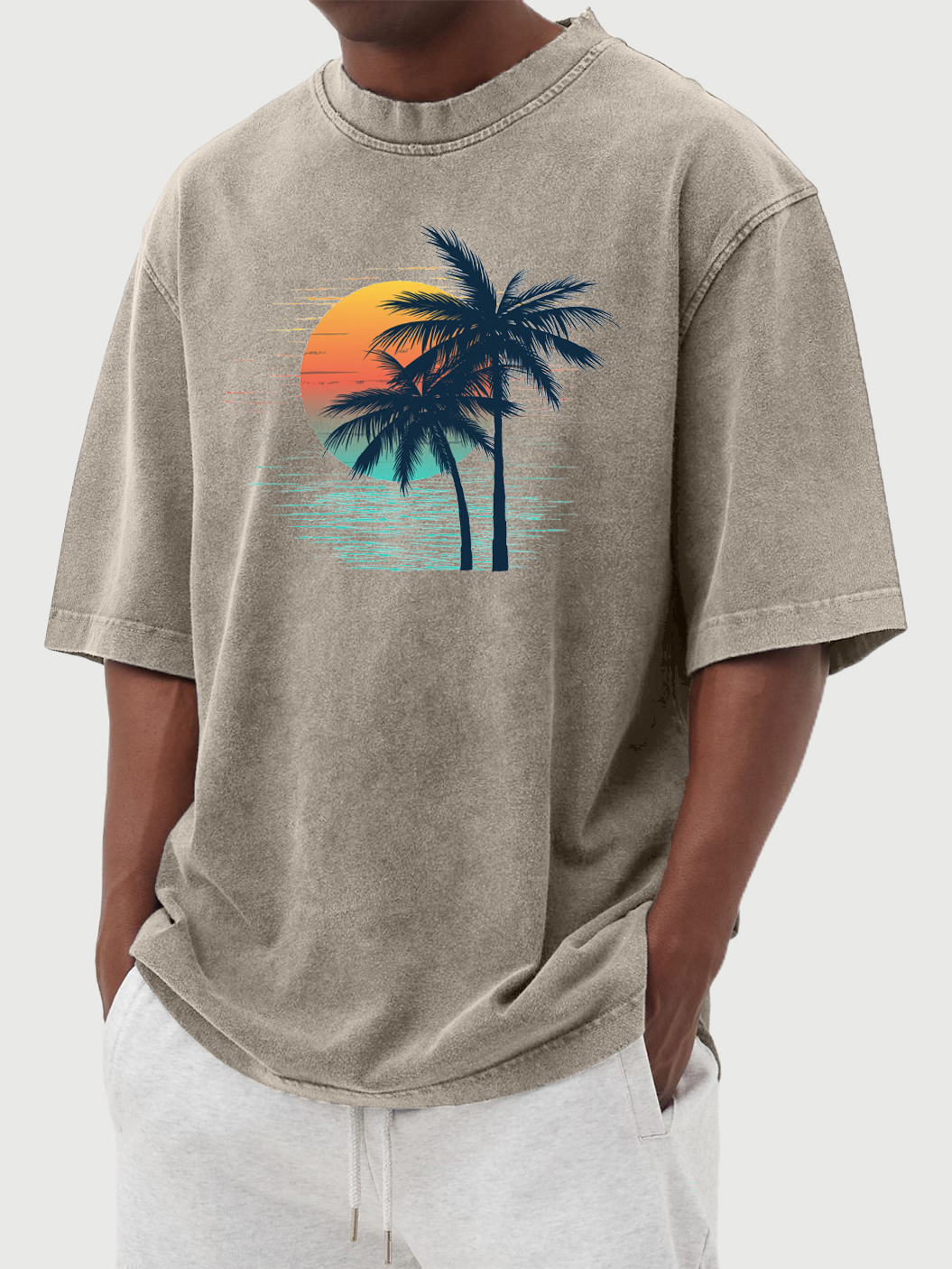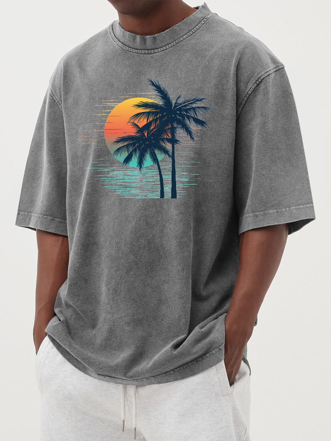 230g100% Cotton Washed And Distressed Palm Tree Print Short-sleeved T-shirt