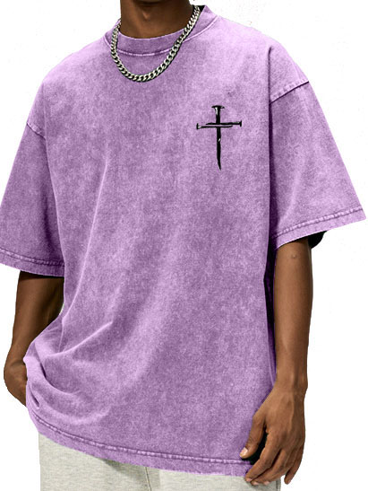 Men's And Women's Pure Cotton Distressed Washed Retro Cross Print Short-sleeved T-shirt