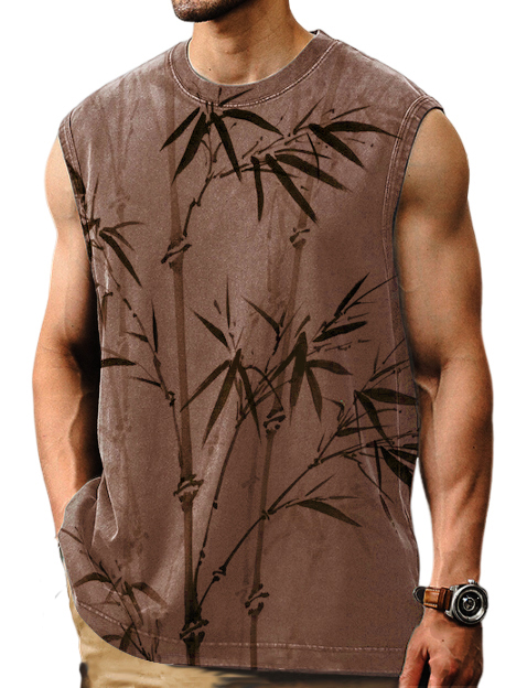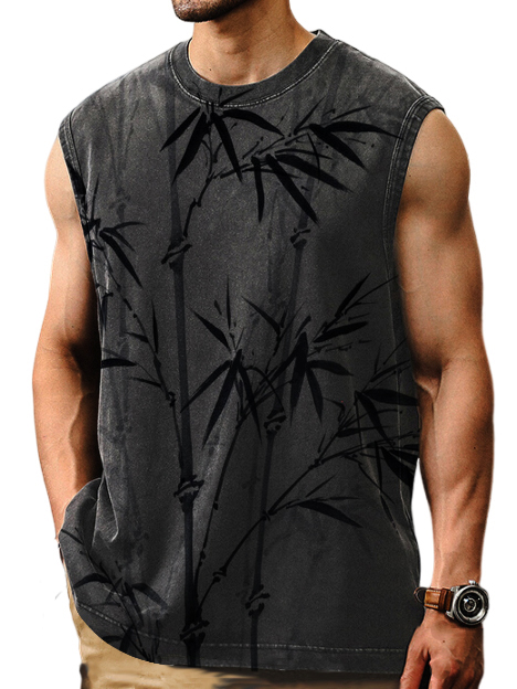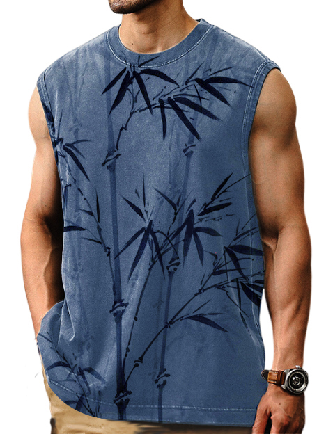 Men's Casual Comfortable Bamboo Print Distressed Sleeveless T-Shirt