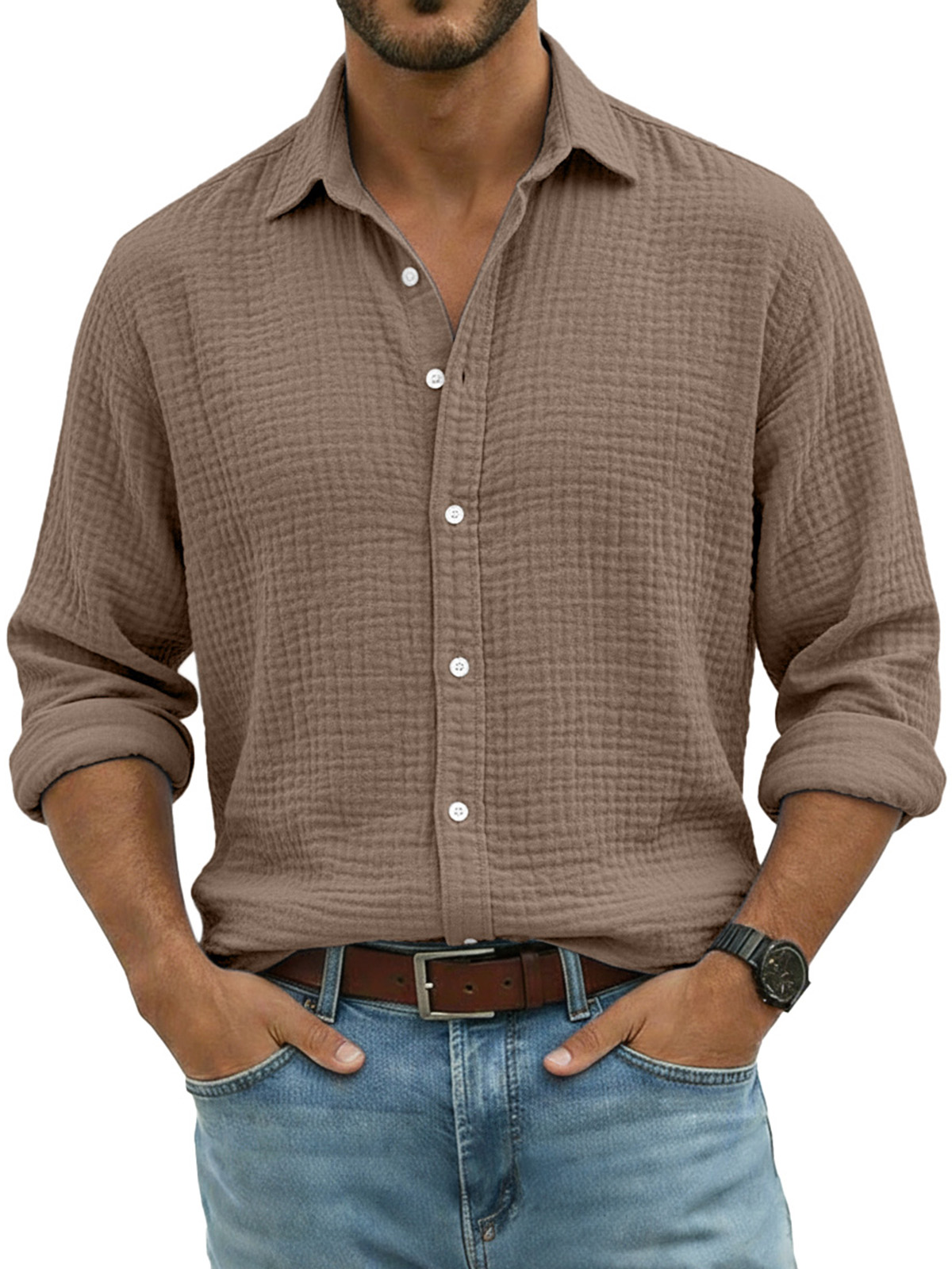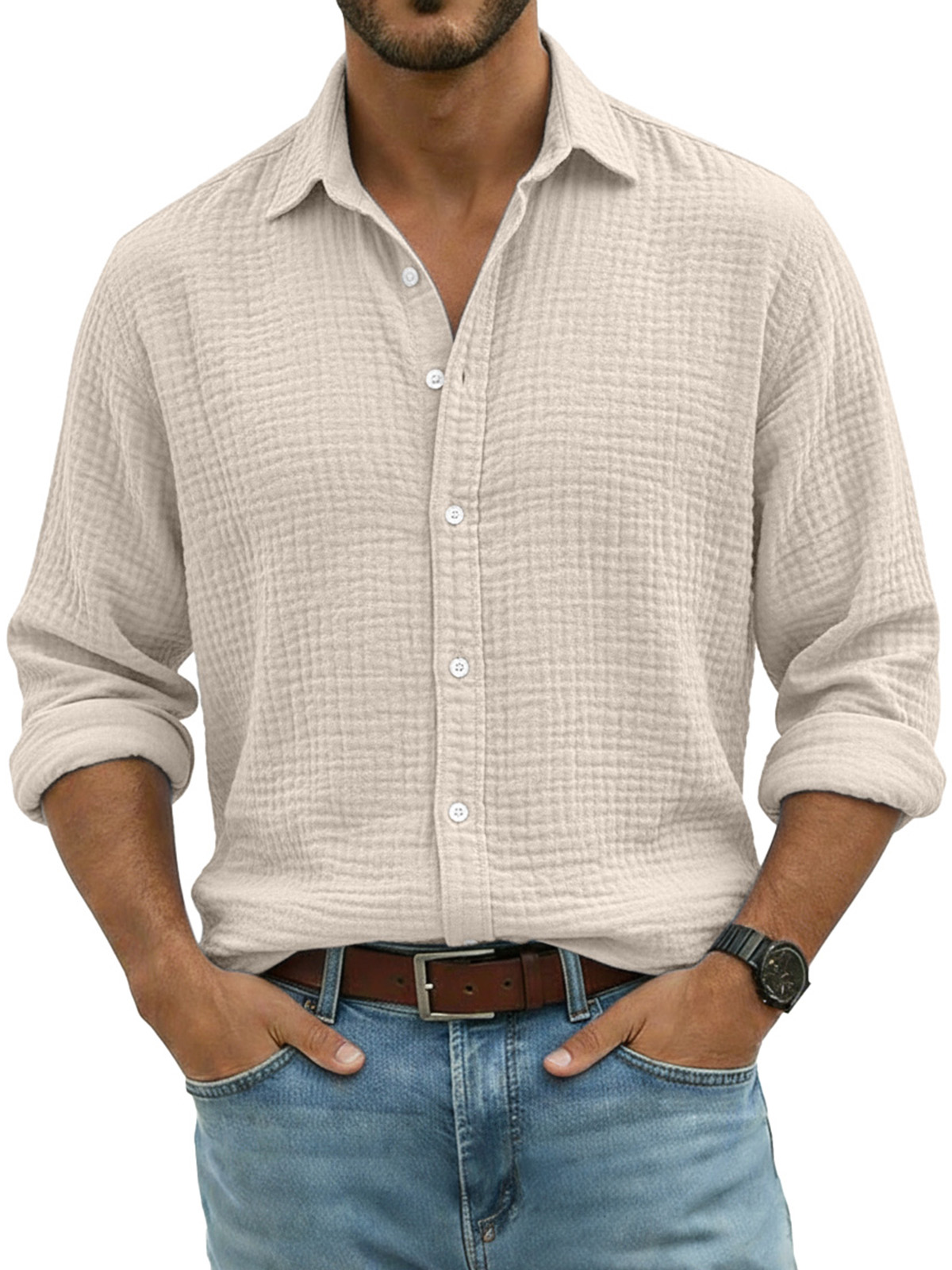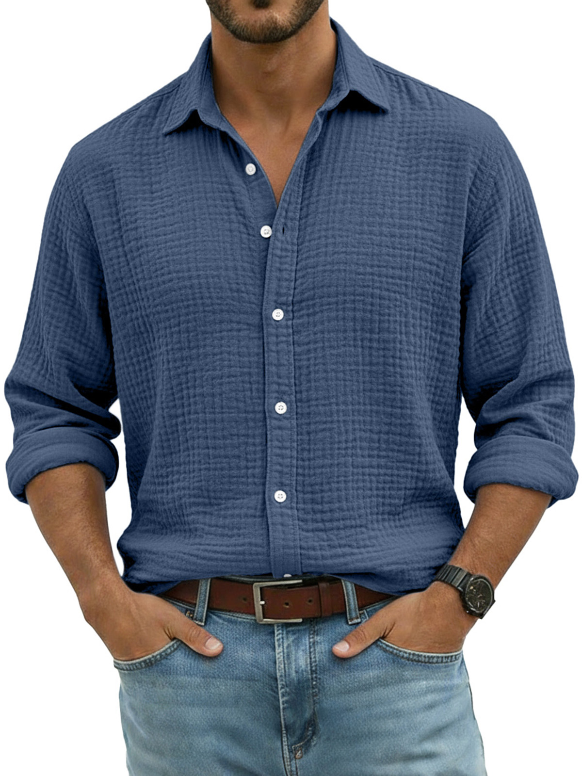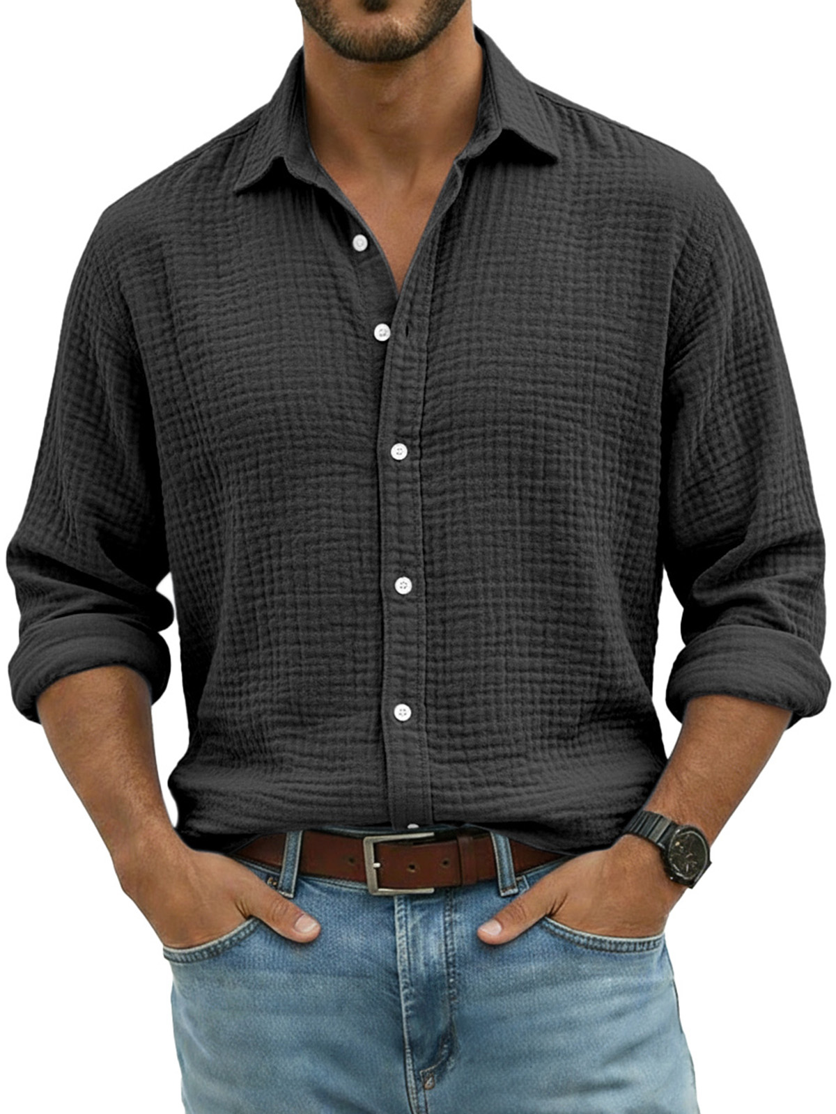 Men's Comfortable Solid Color Crinkled Breathable Long-sleeved Shirt