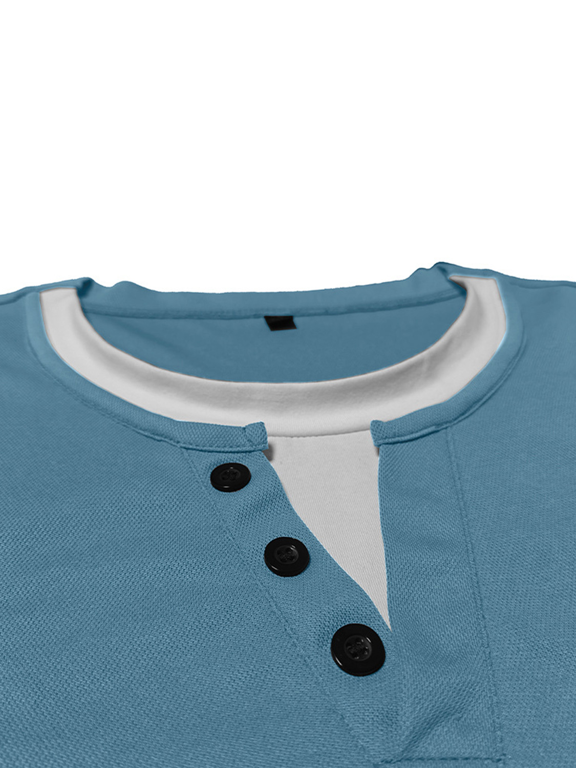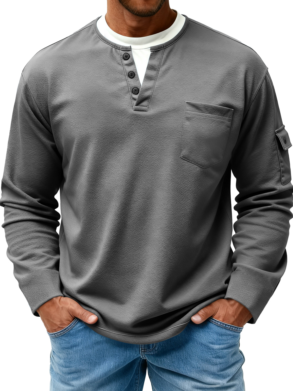 Men's Double-Layer Collar Faux Two-Piece Casual Long-Sleeve T-Shirt with Side Pockets