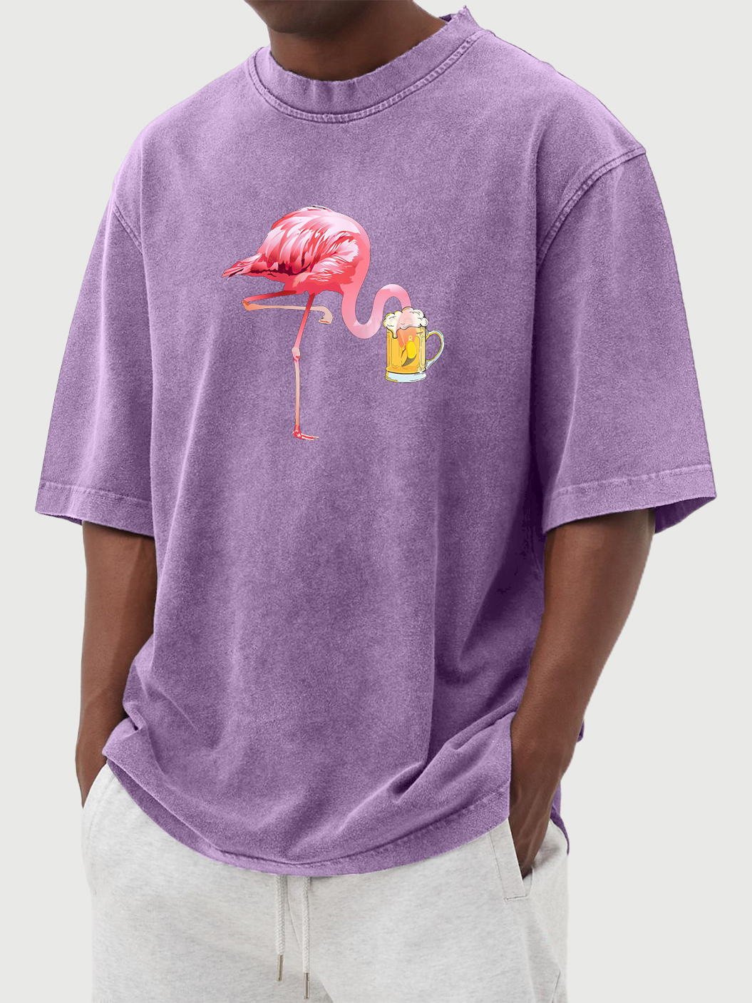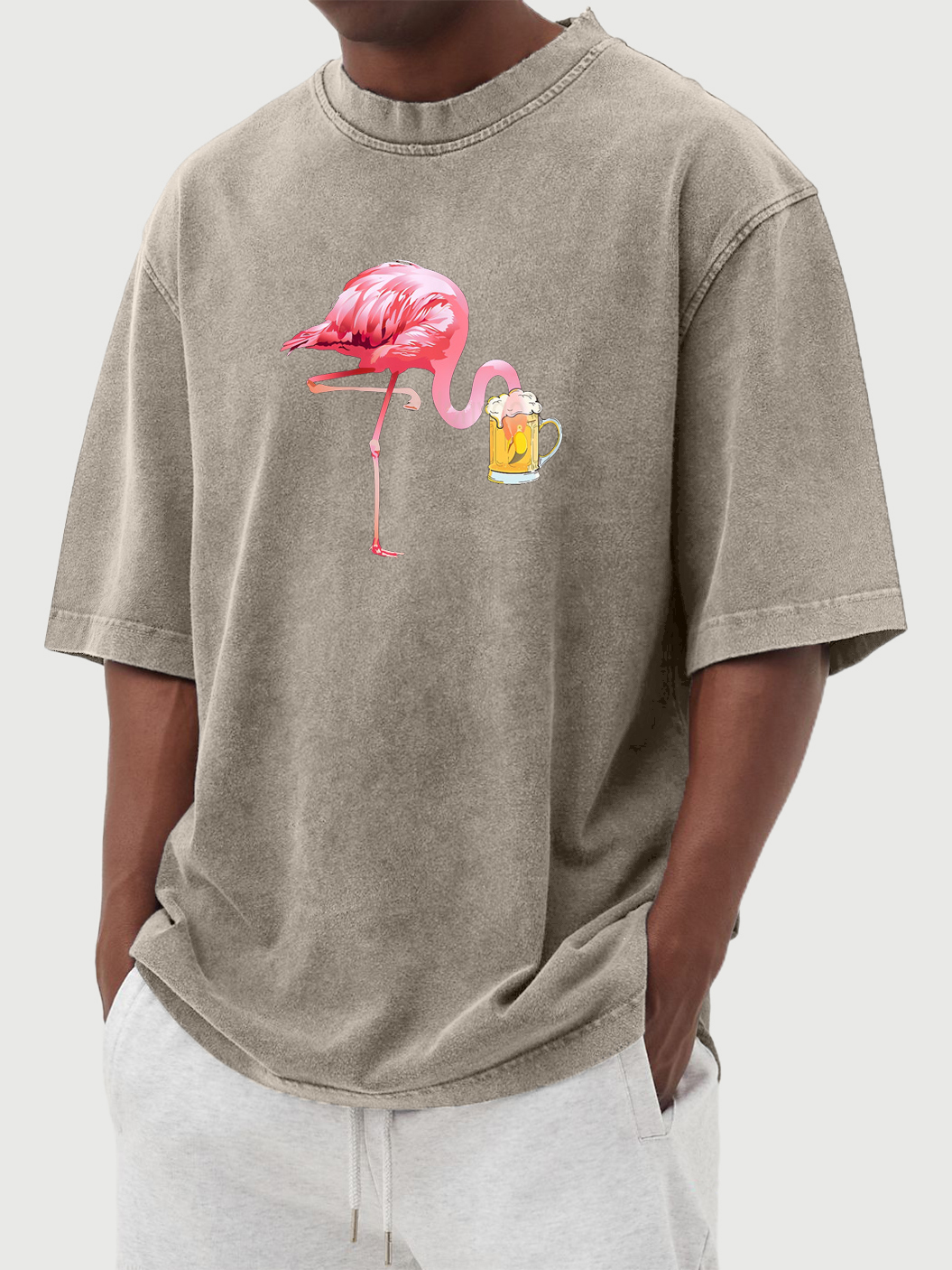 Men's Flamingo Beer Print Washed Distressed Cotton T-Shirt Top
