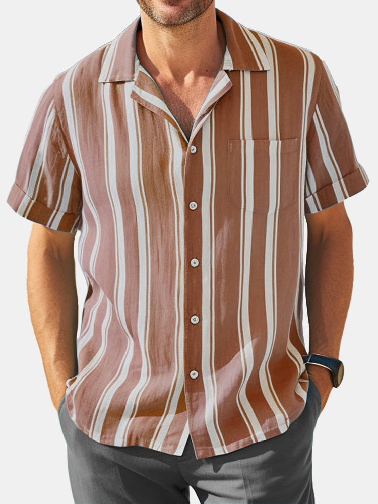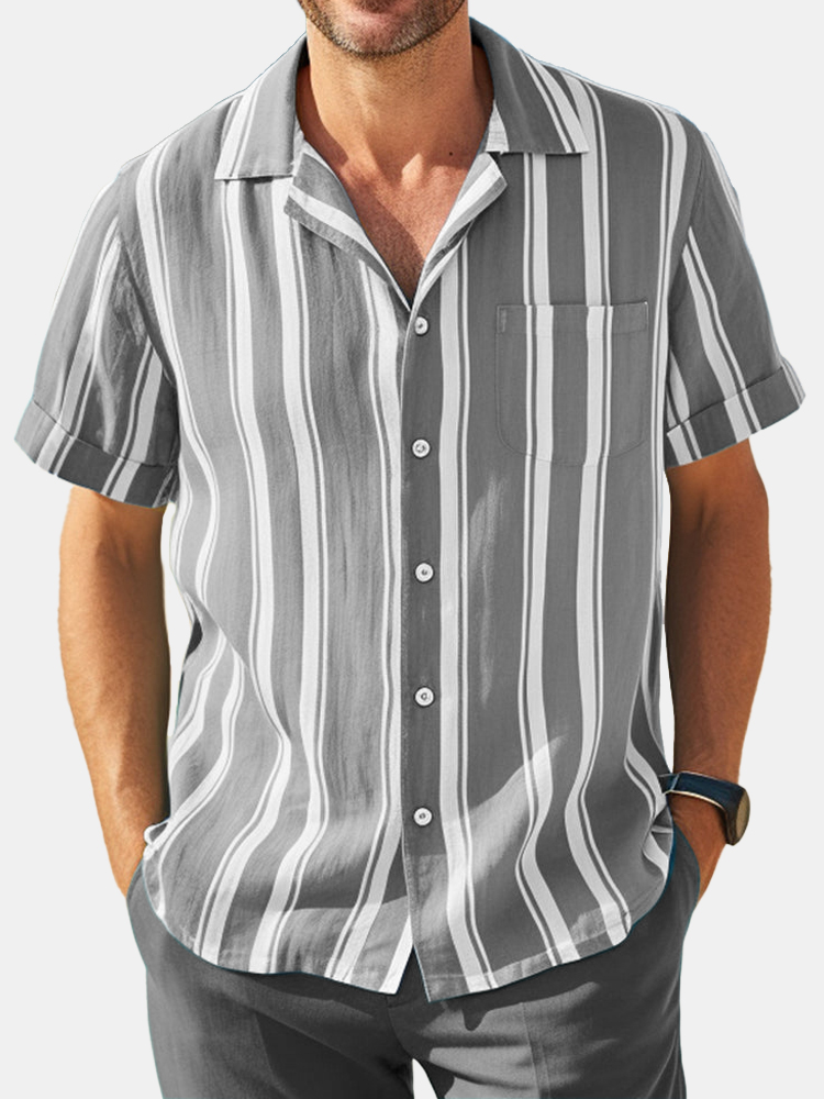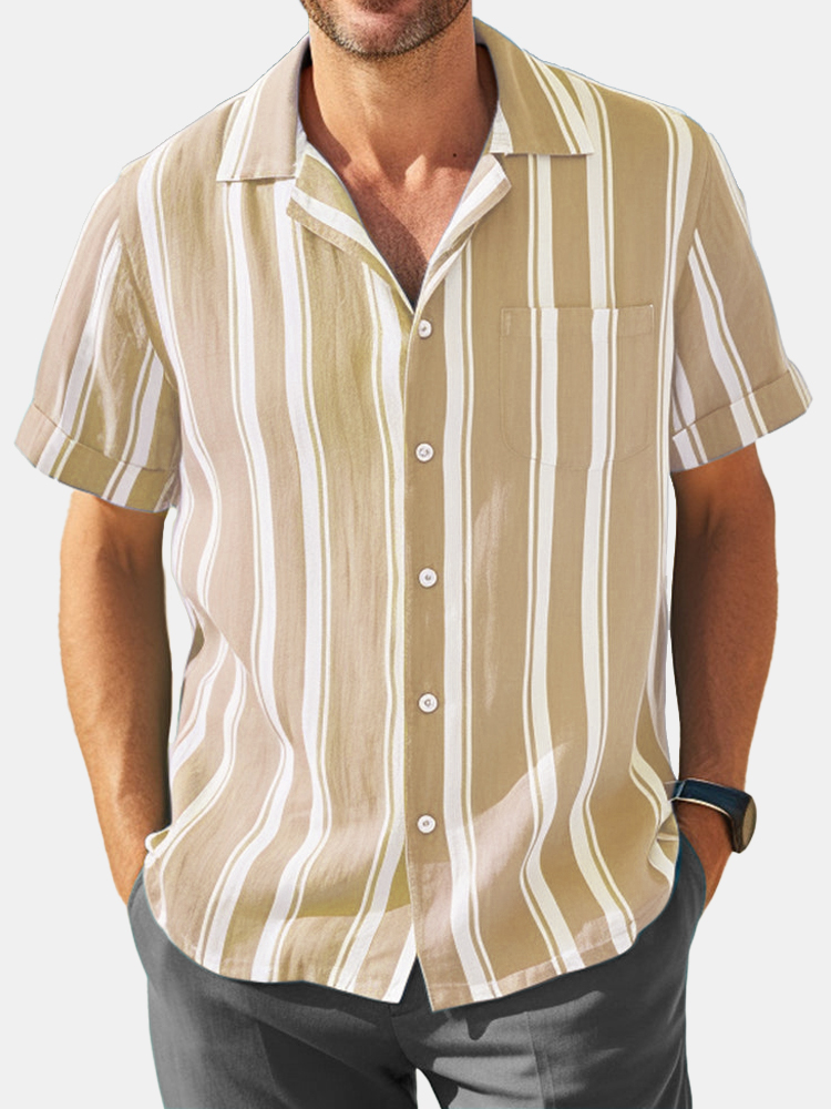 Men's Hawaiian Simple Striped Faux Linen Comfortable Short Sleeve Cuban Collar Shirt