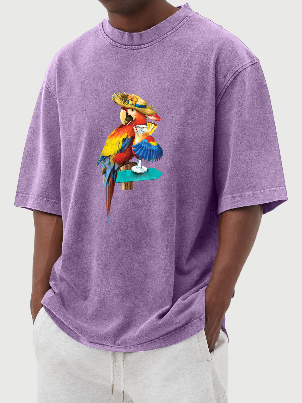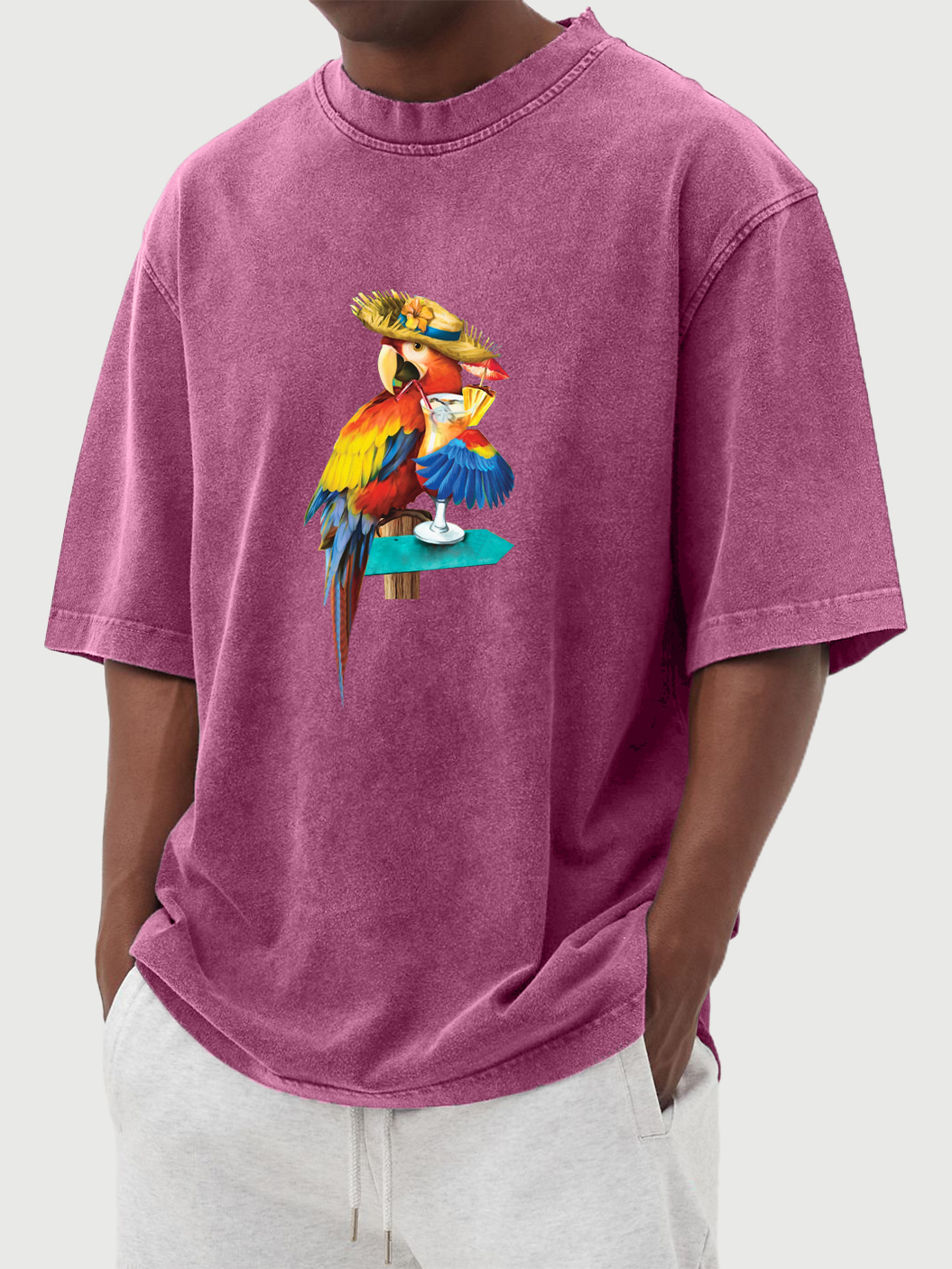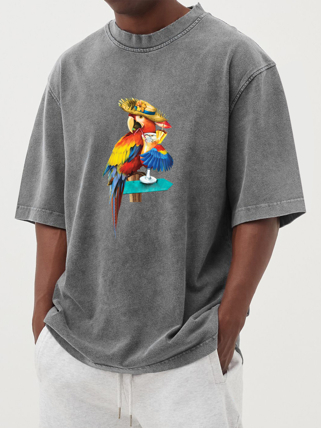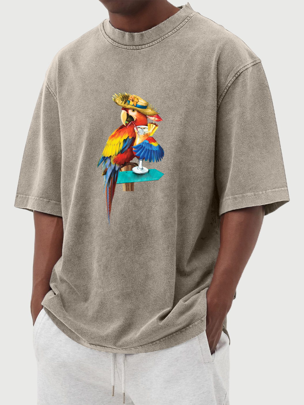 Men's Parrot Cocktail Hawaiian Print Washed Distressed Cotton T-Shirt Top