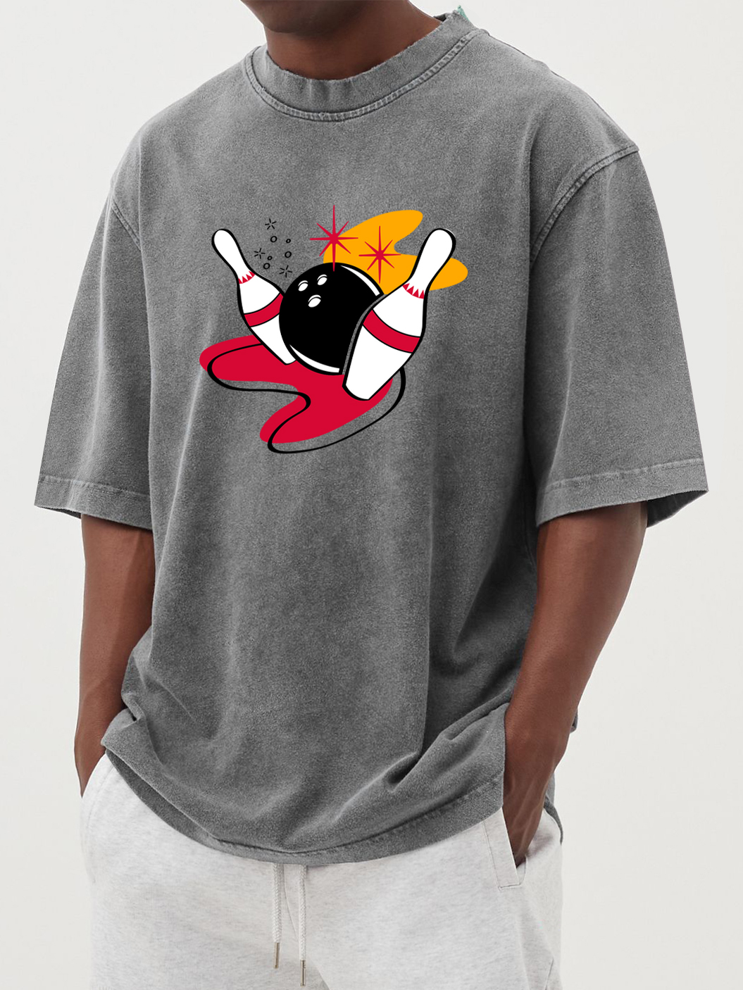 Men's Retro Bowling 100% Cotton Washed Distressed Short-sleeved T-shirt