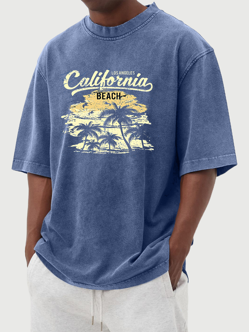 Men's Retro Washed Distressed California Beach Coconut Print Short Sleeve T-Shirt