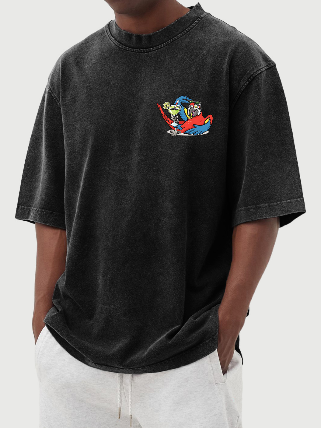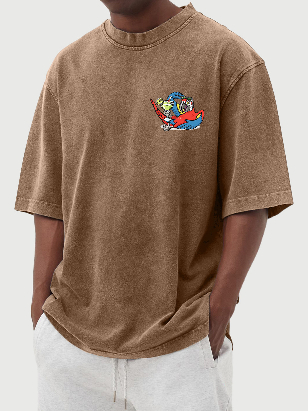 Men's Retro Washed Distressed Parrot Cocktail Print Short Sleeve T-Shirt