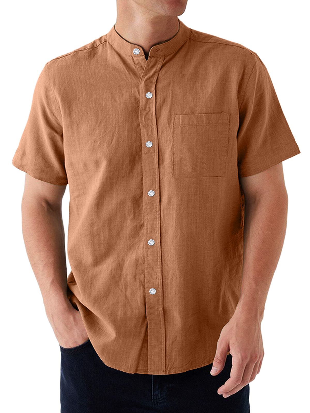 Men's summer cotton and linen solid color stand collar short-sleeved shirt