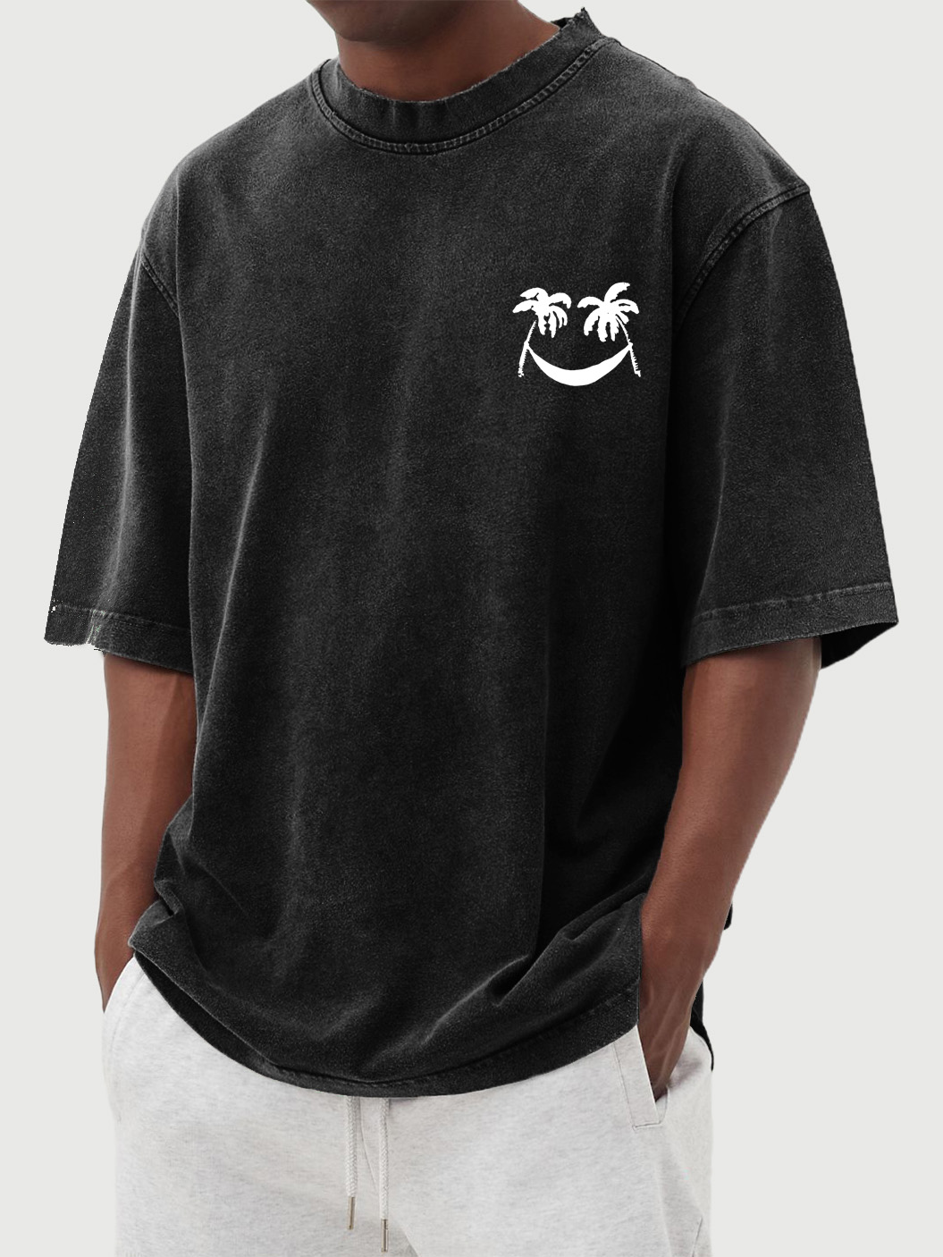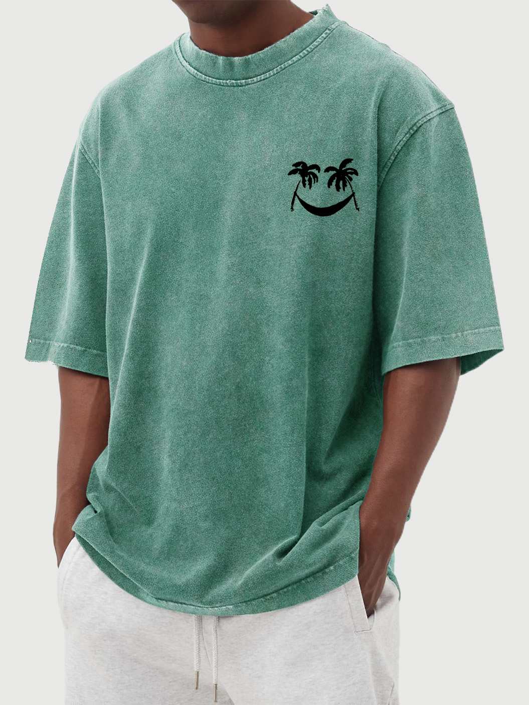 Men's Vintage Wash Smiley Coconut Tree Print Short Sleeve T-Shirt