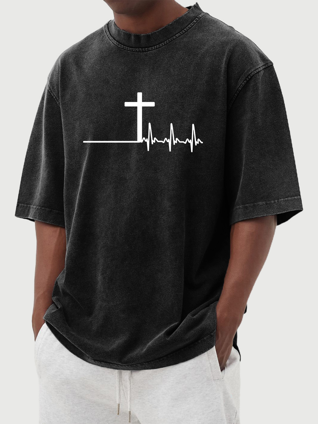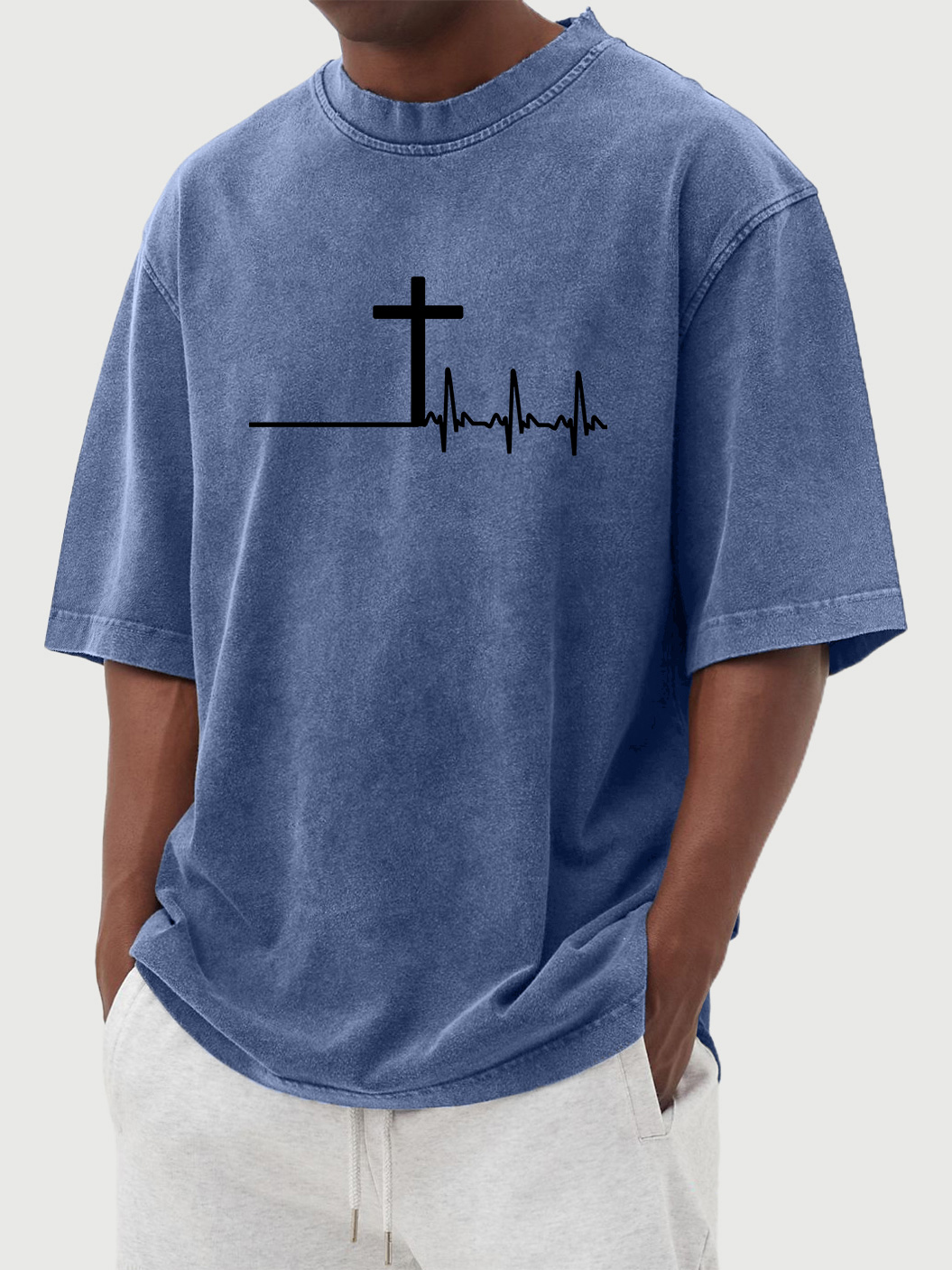 Men's vintage washed distressed cross print short-sleeved T-shirt