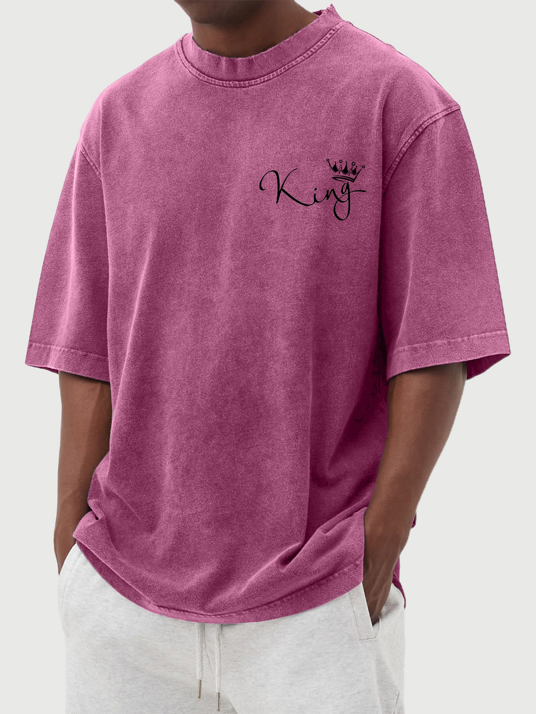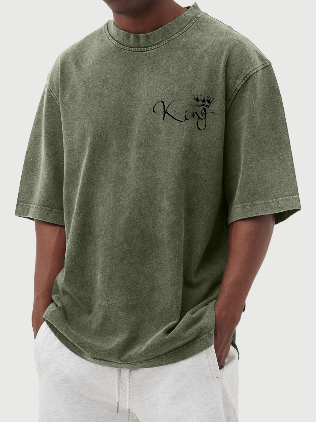 Men's vintage washed distressed King print short-sleeved T-shirt