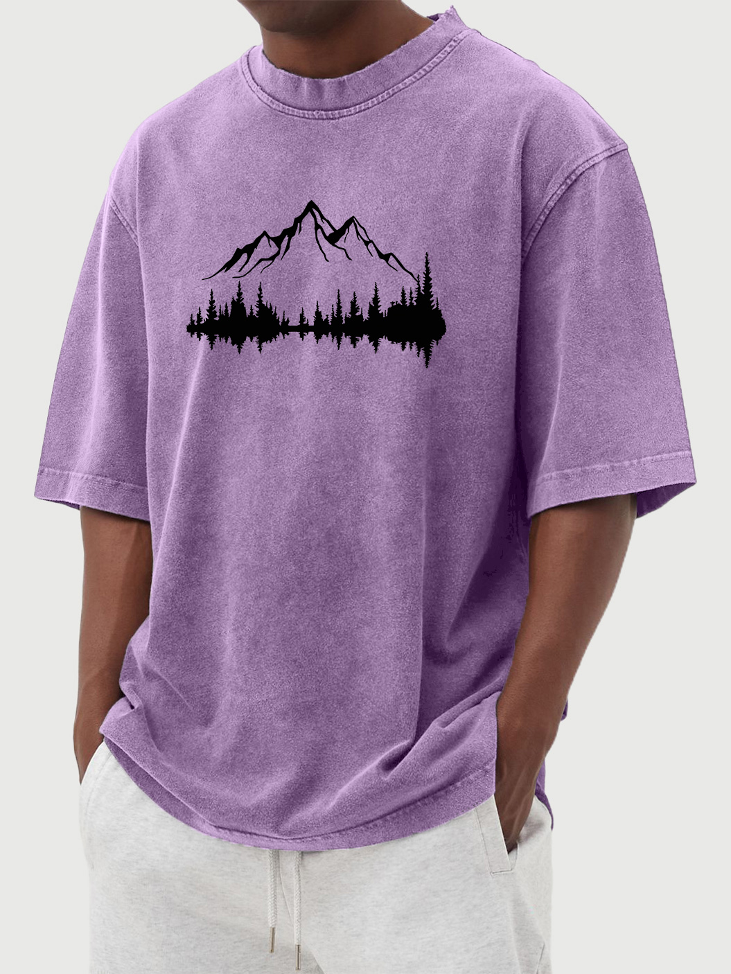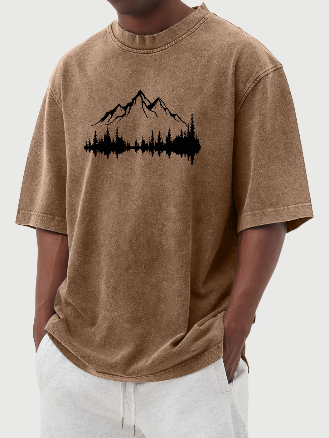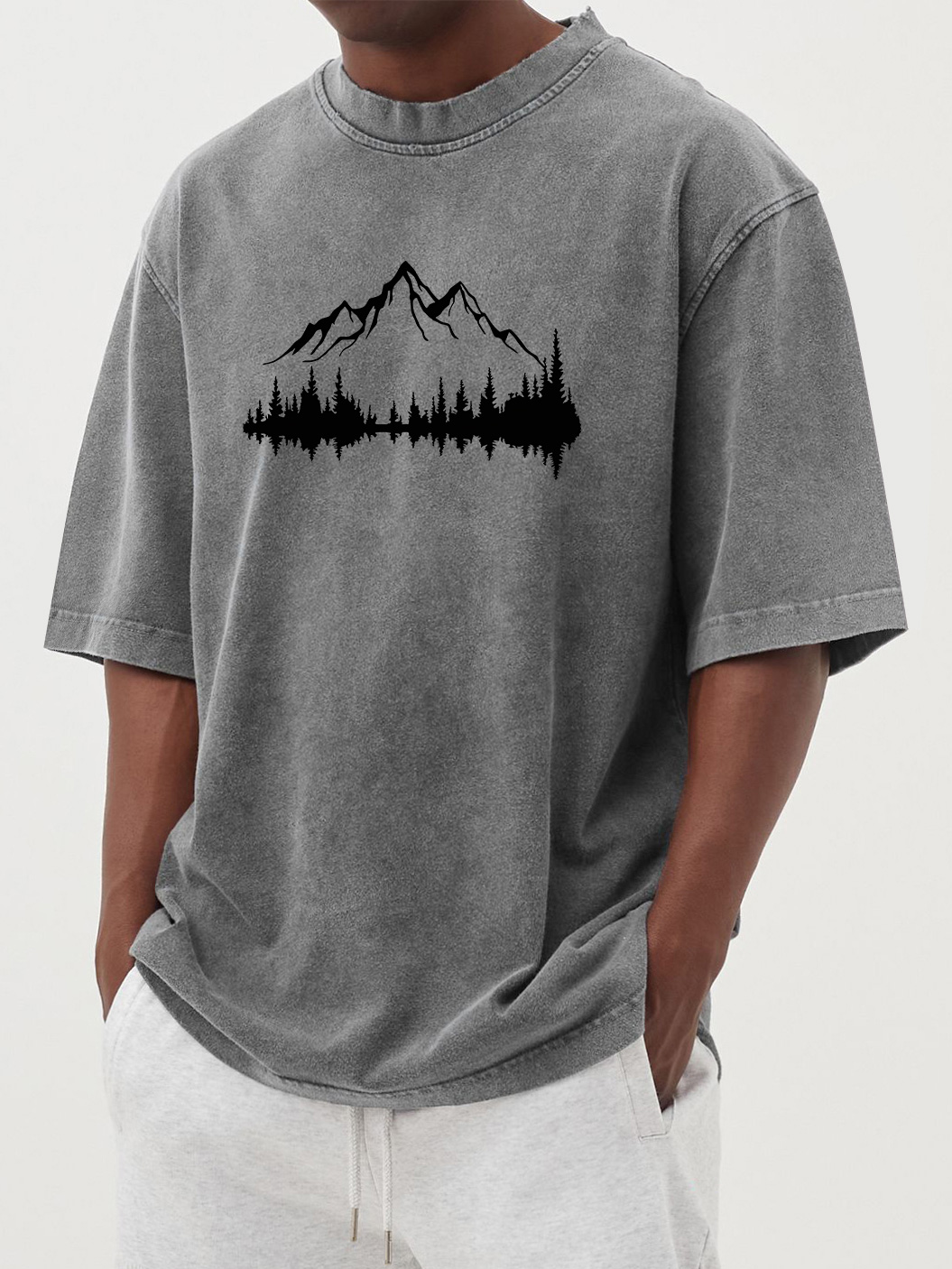 Men's vintage washed distressed mountain and river print short-sleeved T-shirt