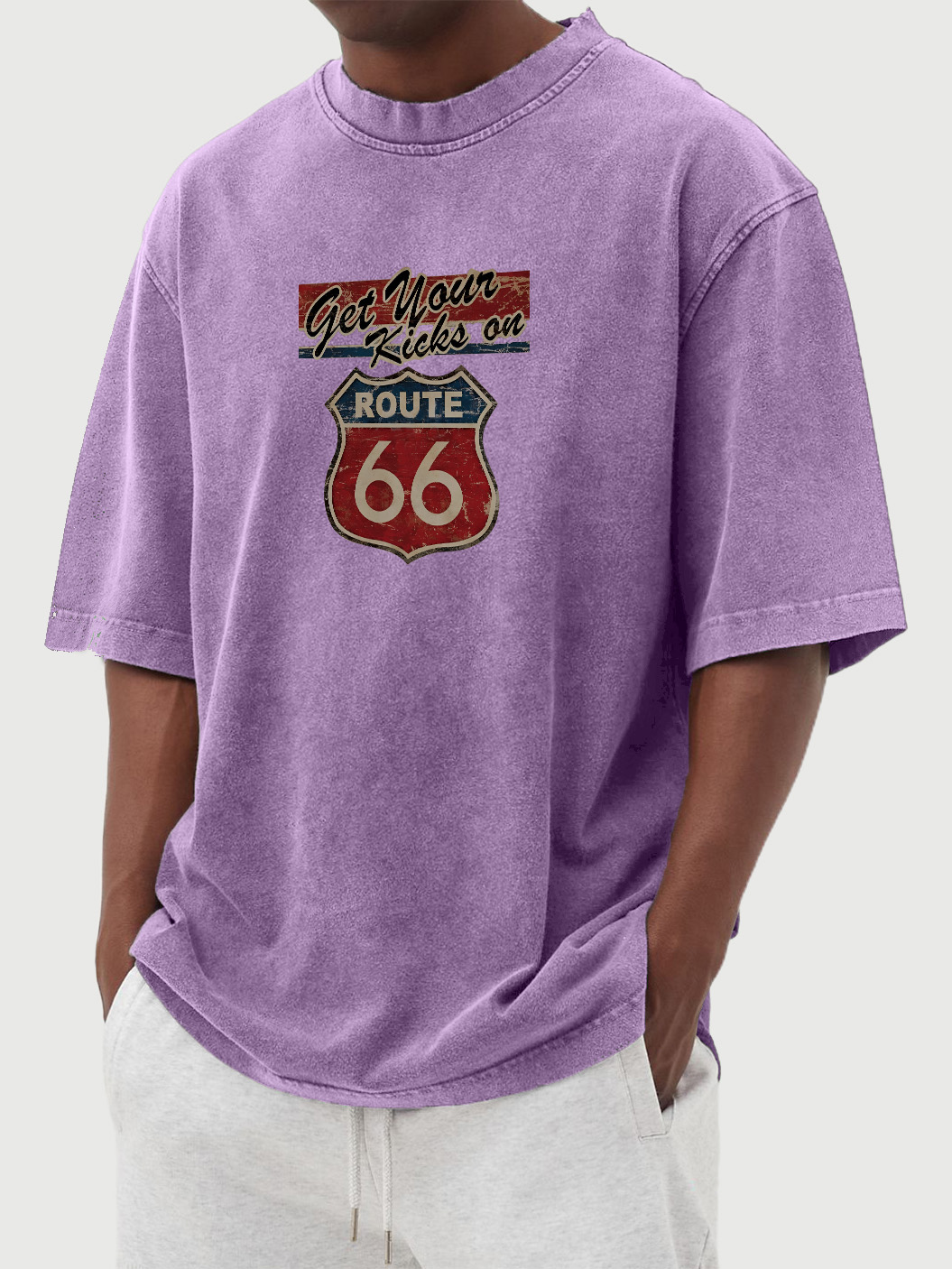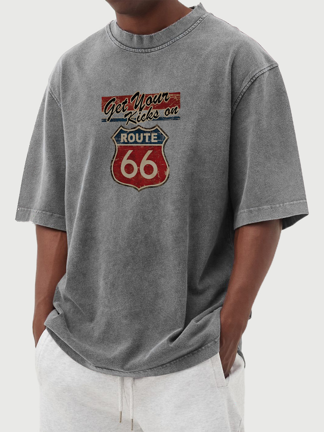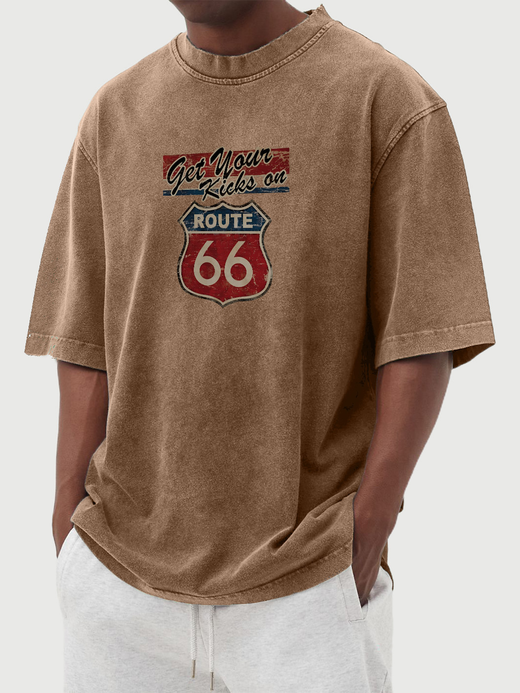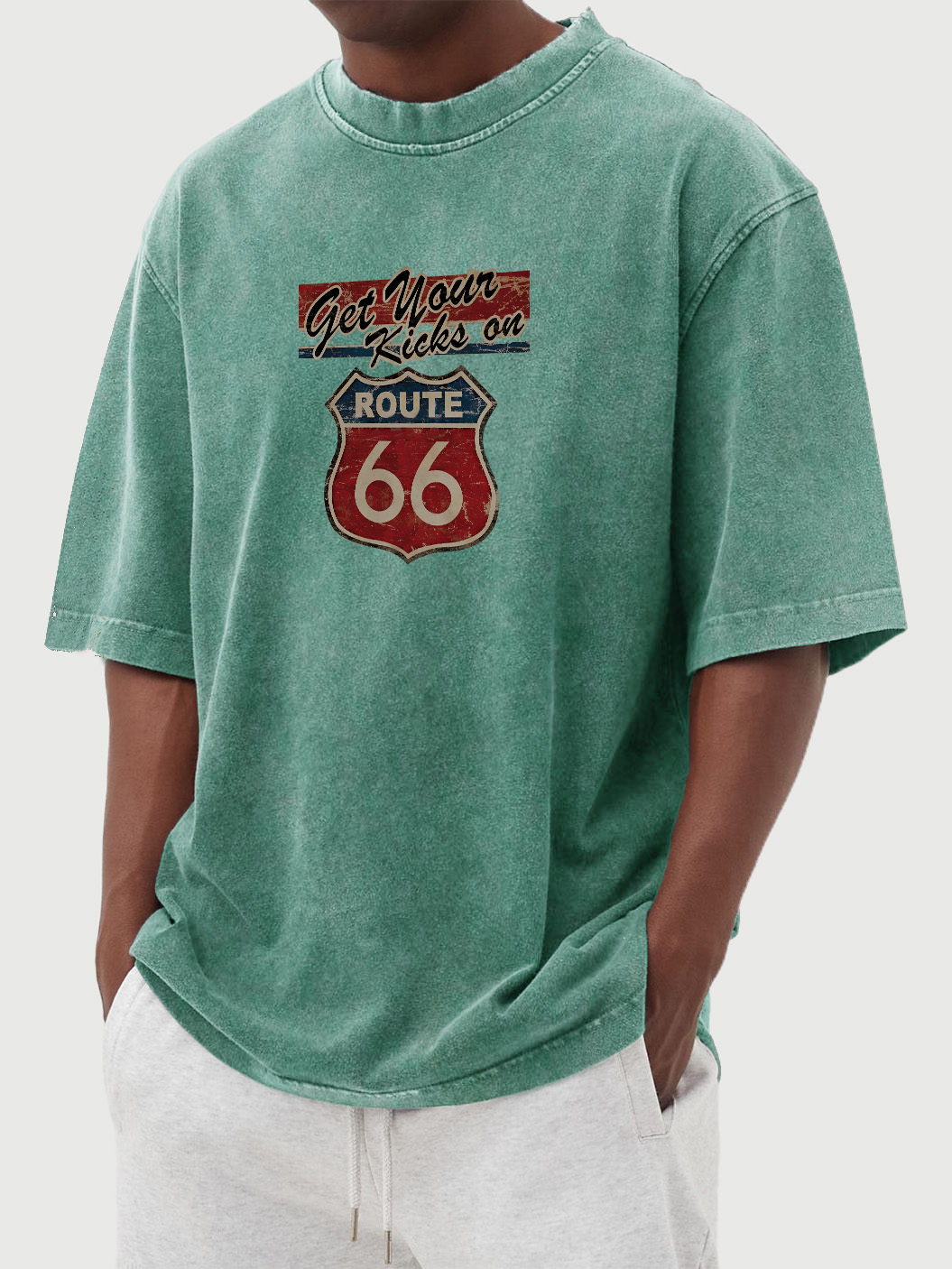 Men's Vintage Washed Get Your Kick On Route 66 Printed Short-sleeved T-shirt