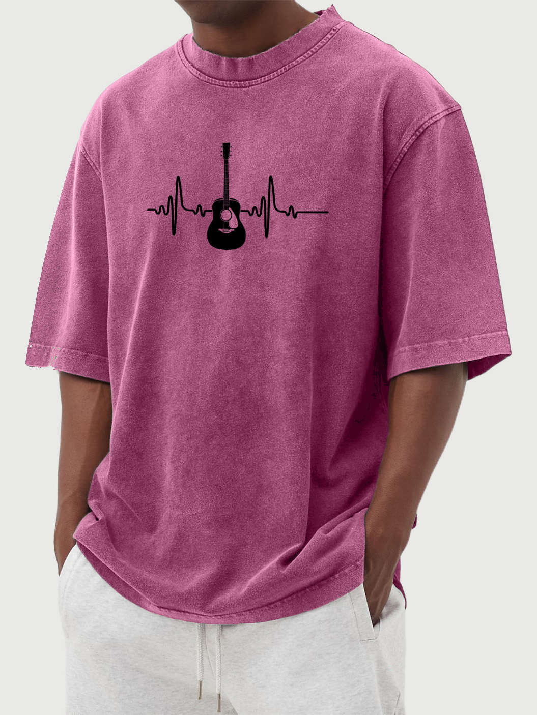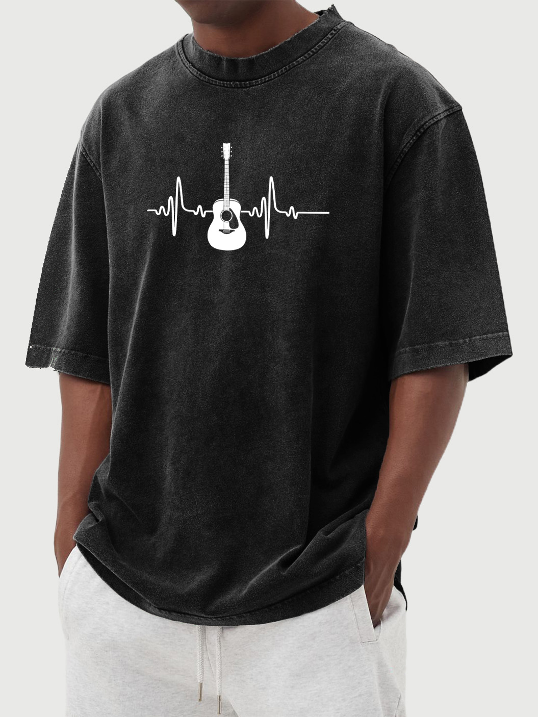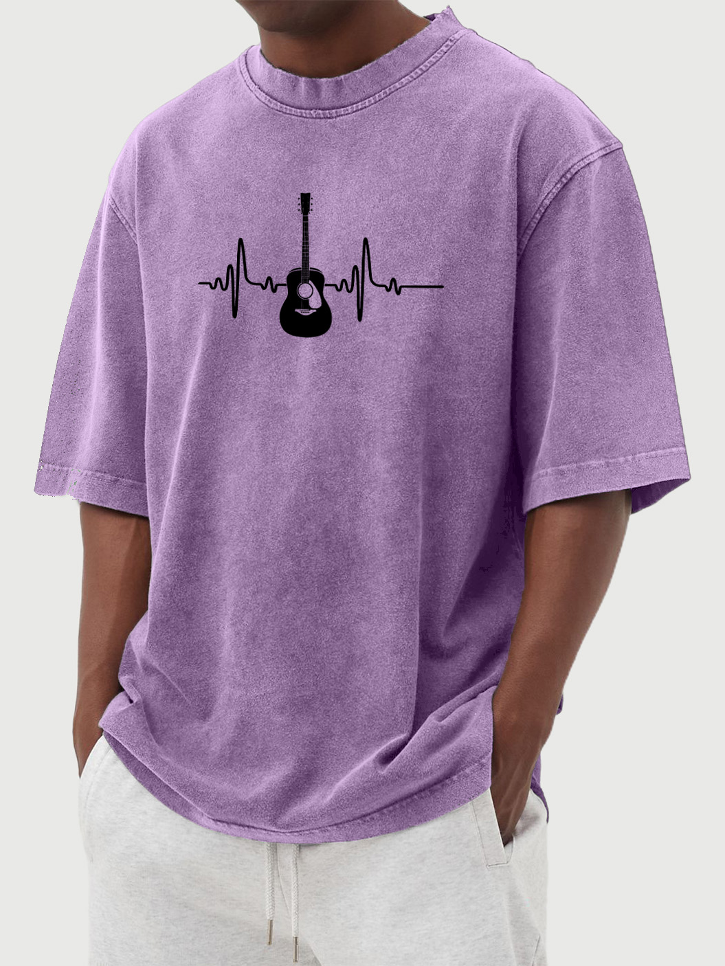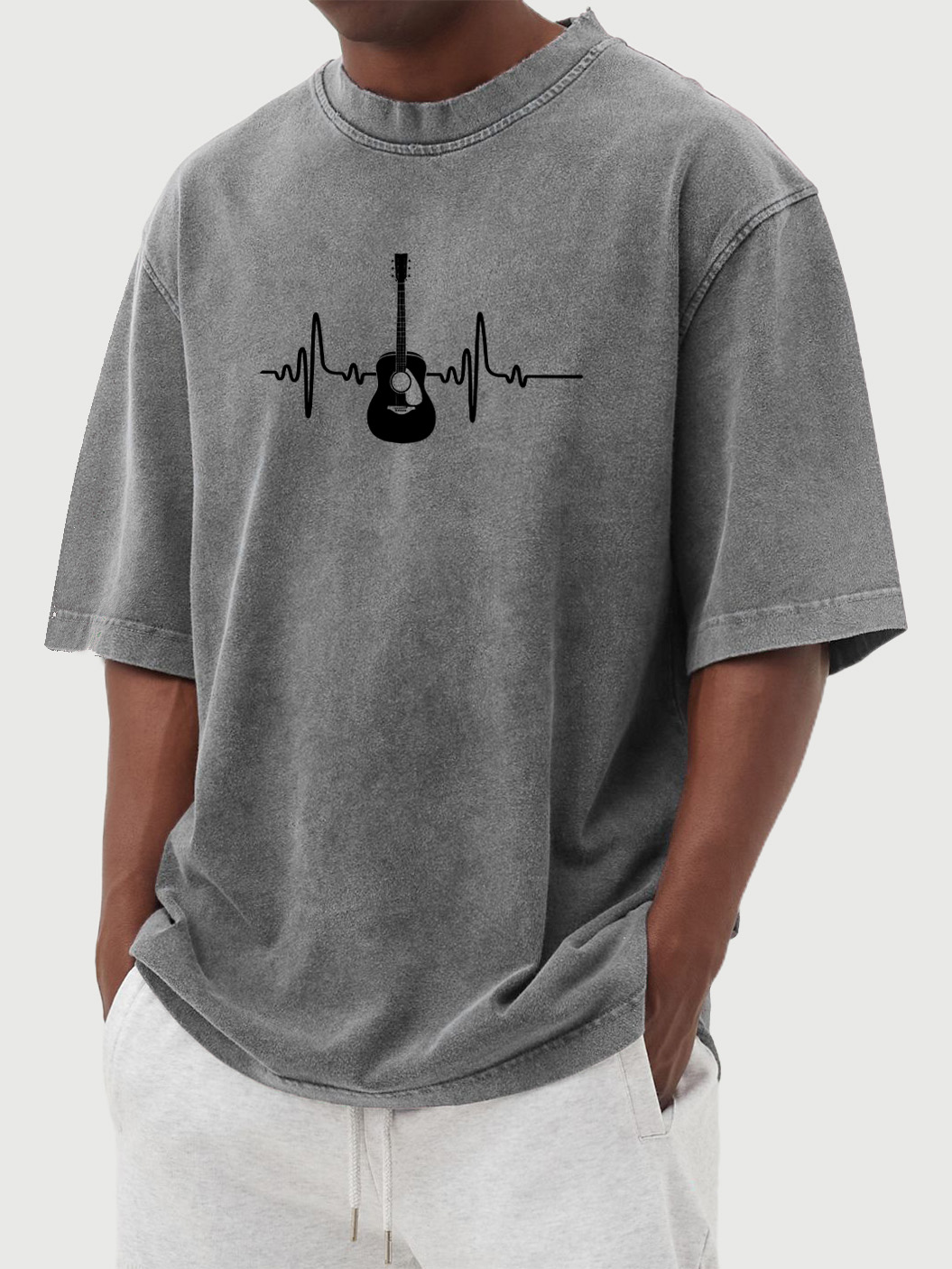 Men's Vintage Washed Guitar Music Print Cotton Short Sleeve T-shirt