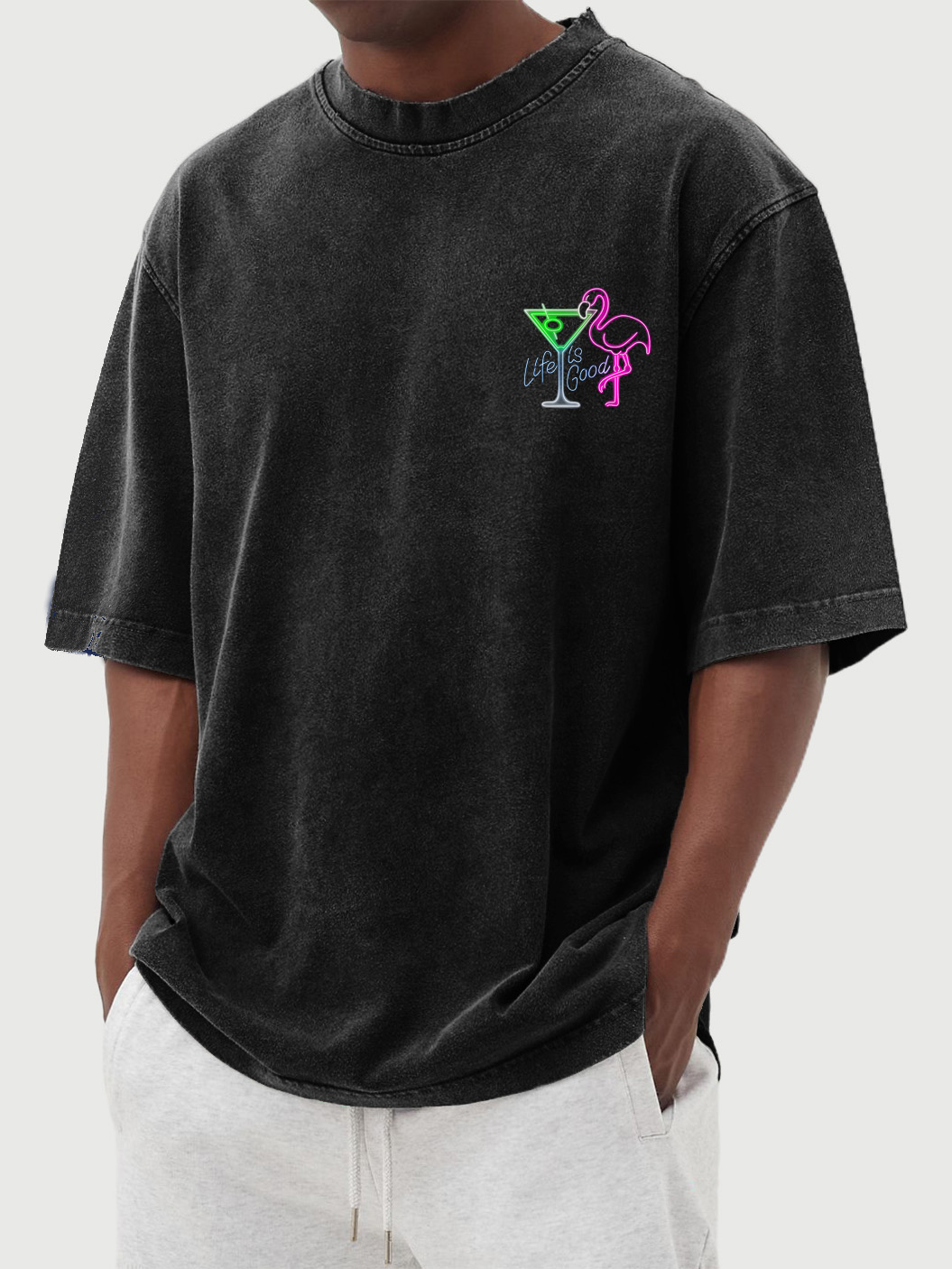 Men's Vintage Washed Hawaiian Cocktail Glass And Flamingo Print Short-sleeved T-shirt