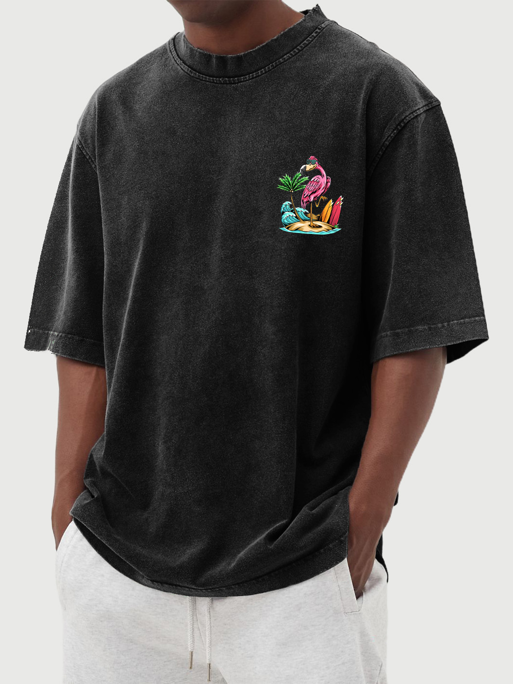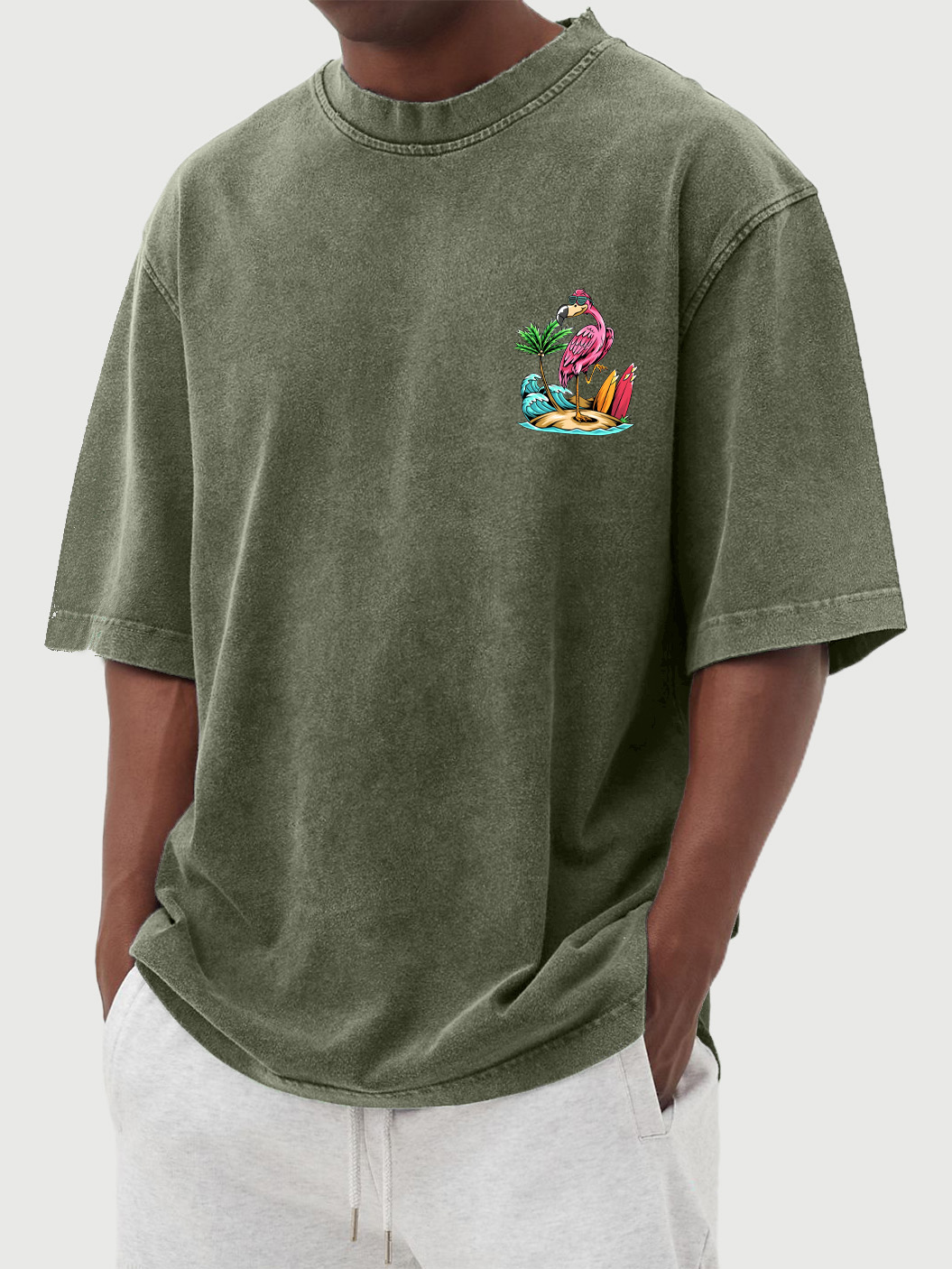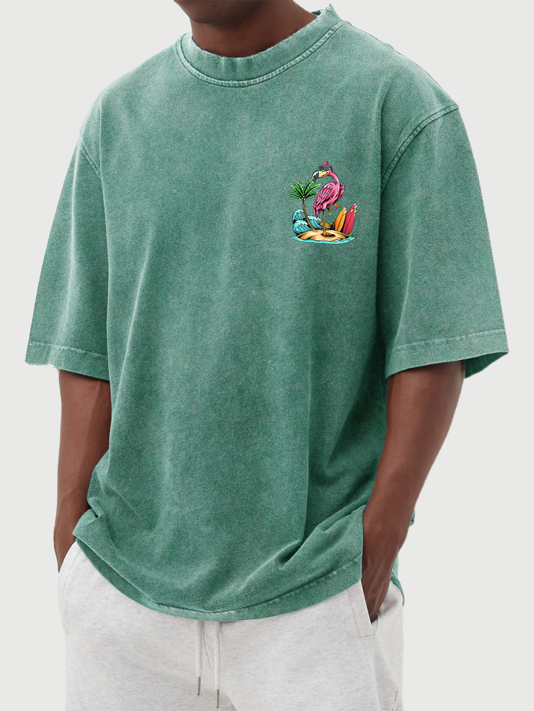 Men's Vintage Washed Hawaiian Flamingo Print Short Sleeve T-shirt