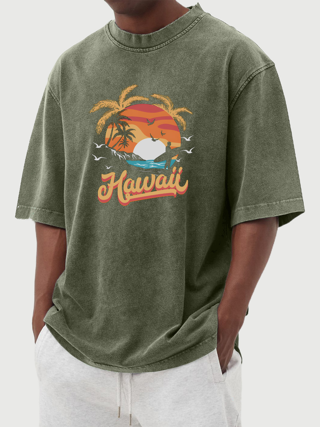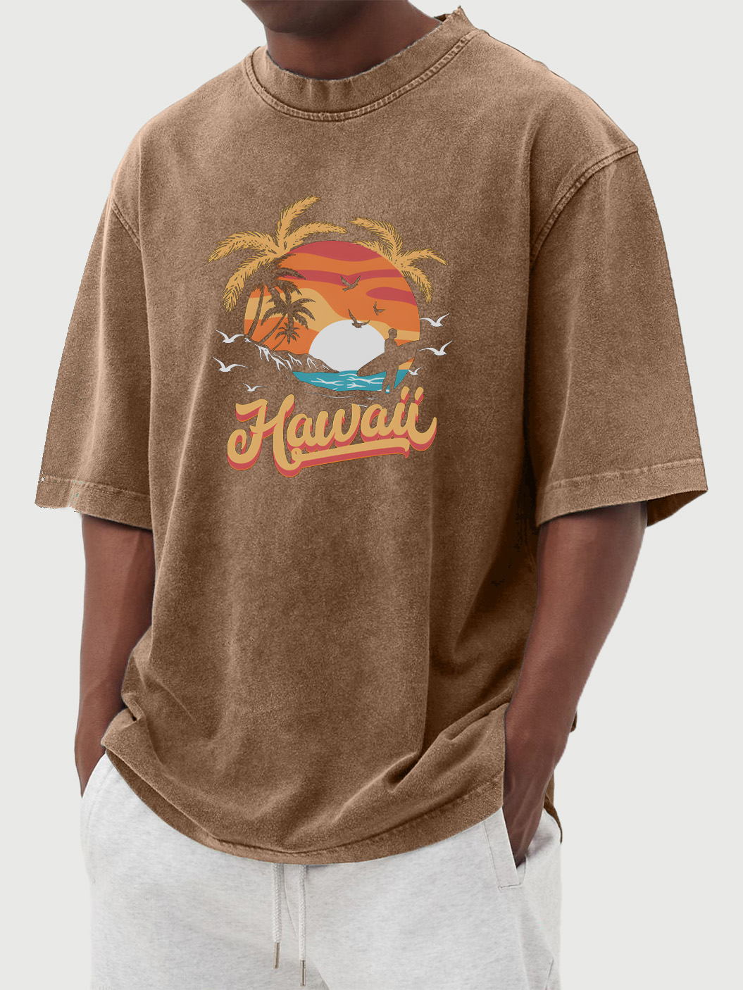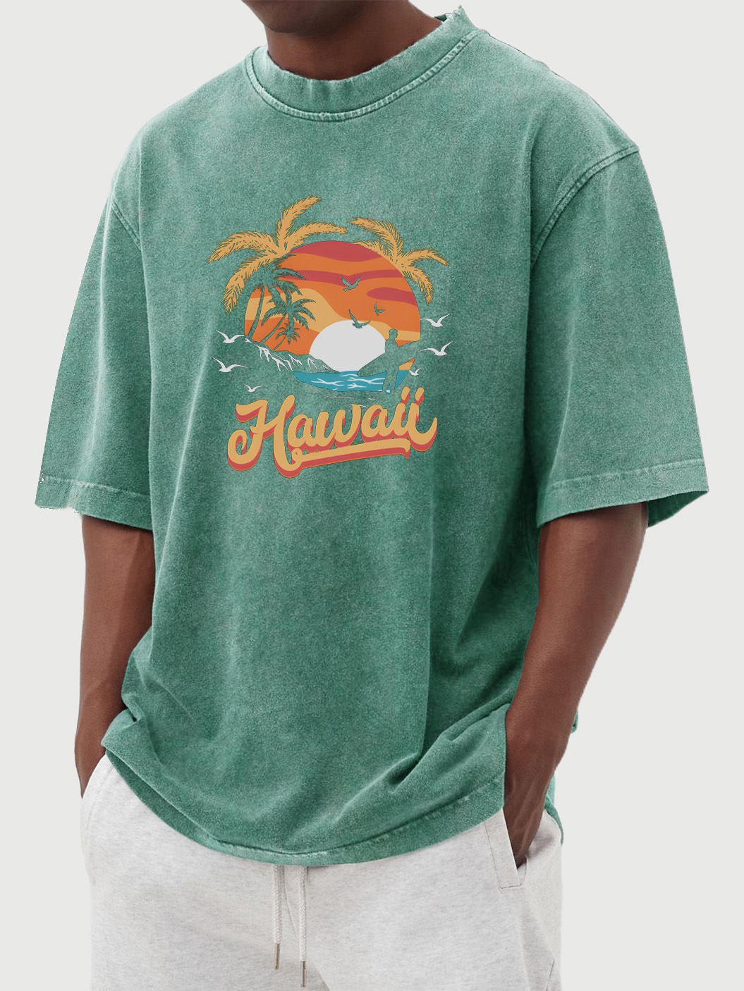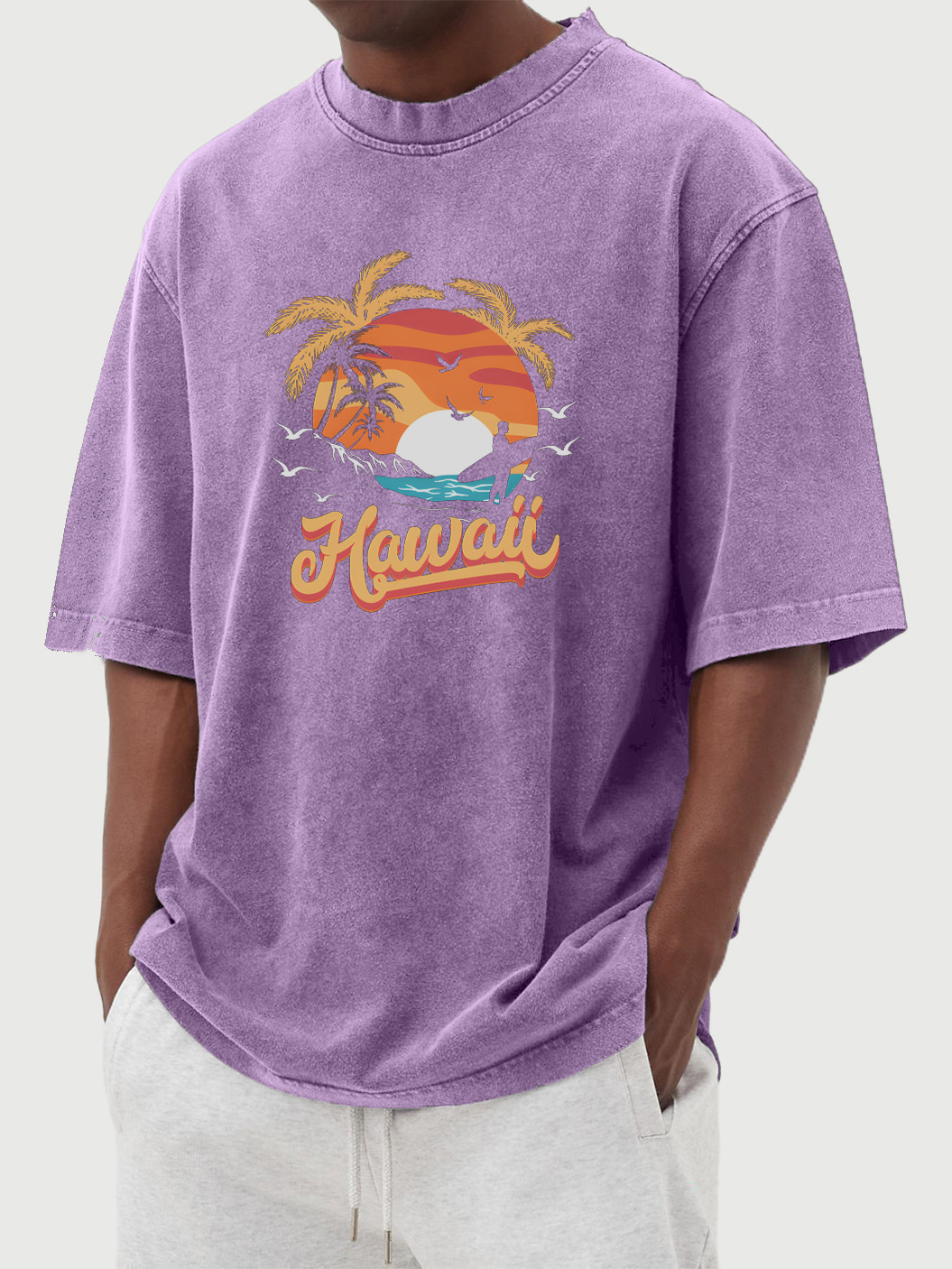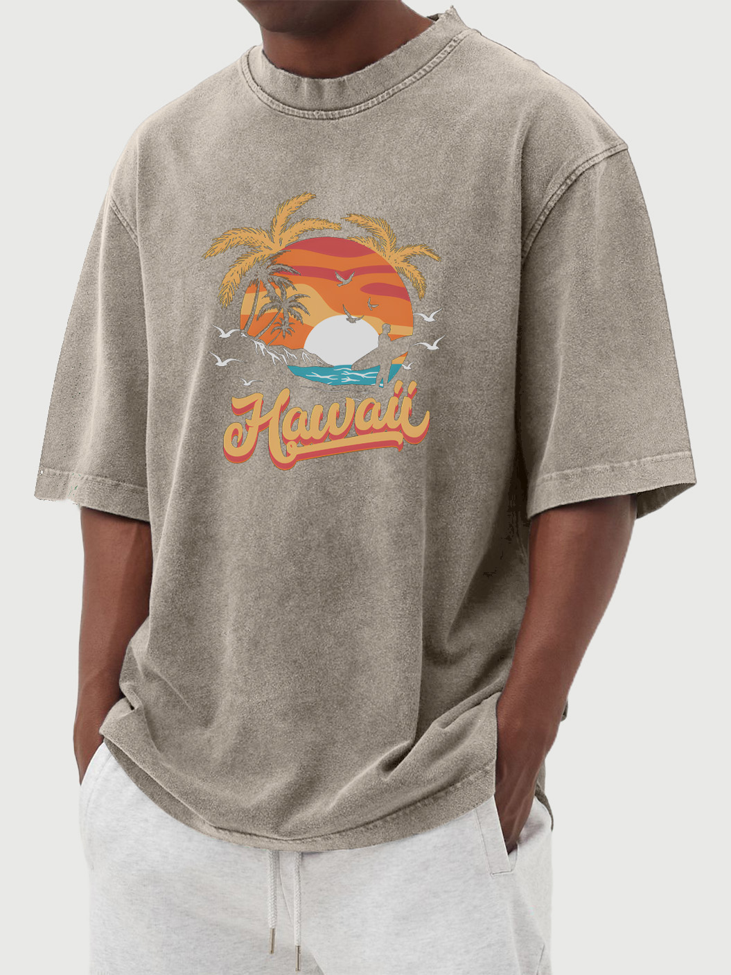 Men's Vintage Washed Hawaiian Vacation Print Short Sleeve T-shirt