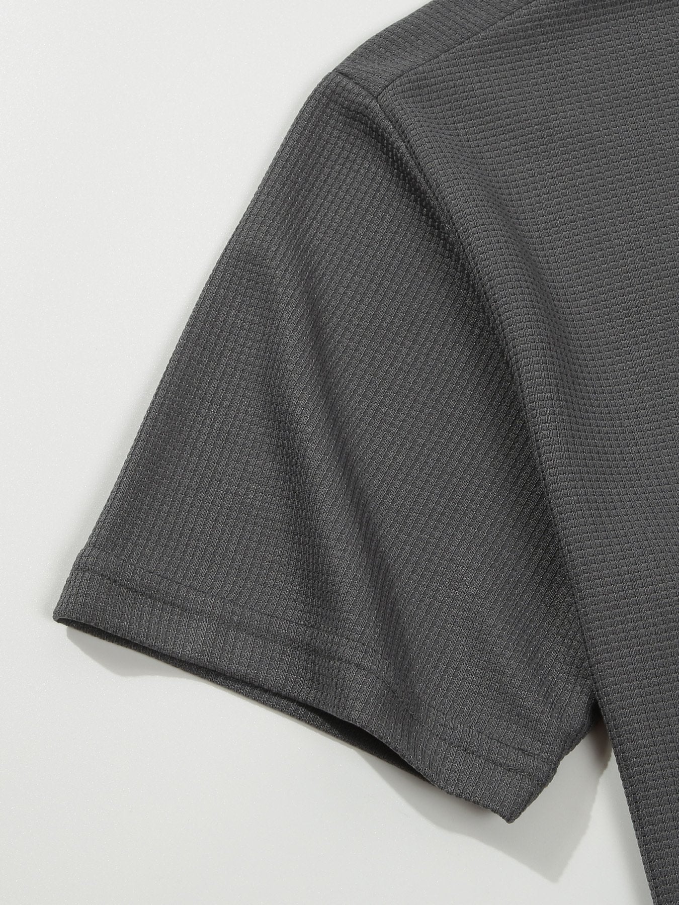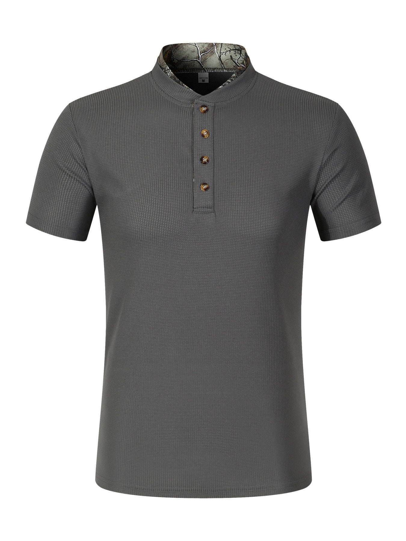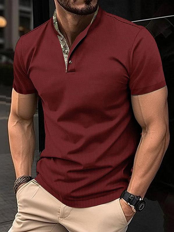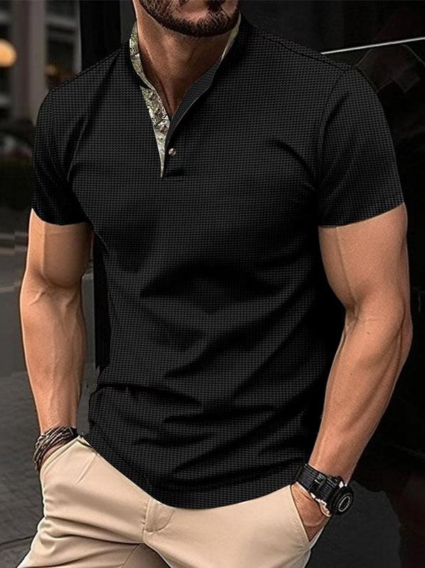 Men's Waffle Knit Patchwork Stand Collar Casual POLO Short Sleeve Top